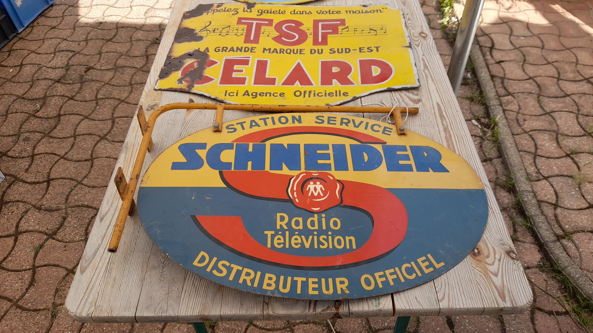 Radio Schneider très bon état, en drapeau avec son support. Deux faces intactes. 60€