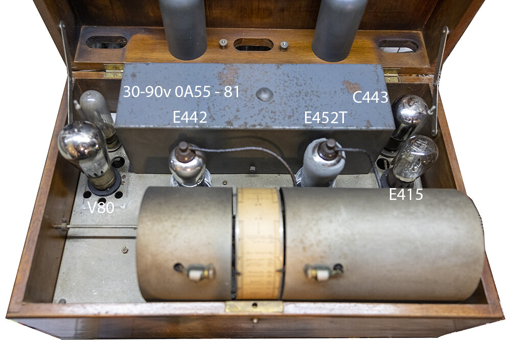 Je remarque que sur certains de ces modèles (avec le même coffret), les fiches comptent la « régulatrice » dans le nombre de lampes et sur d’autres non. Personnellement je la compte, donc 6 lampes: 30-90 V, V80, E442, E452T, E415, C443.