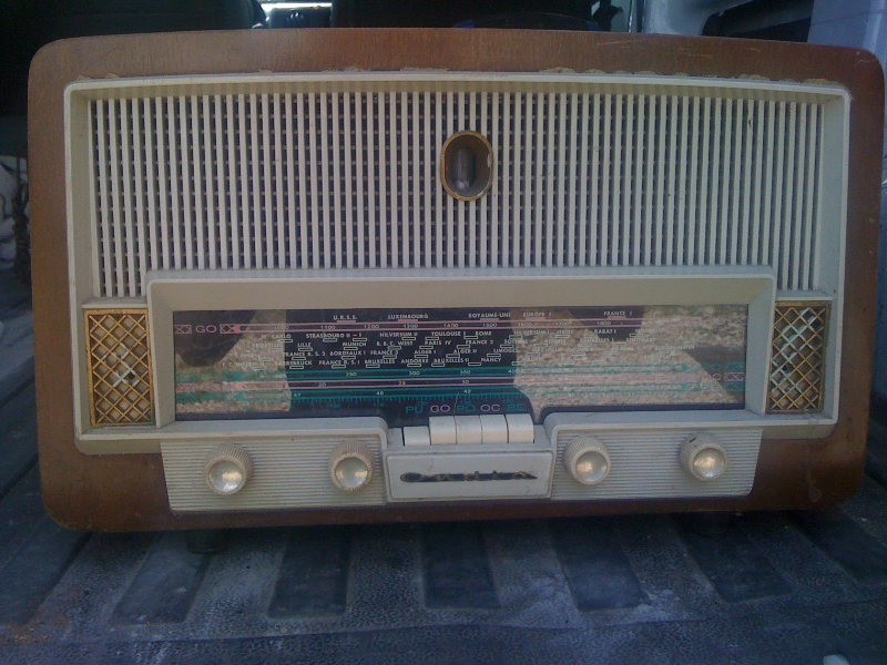 Le Téléfunken a été massacré : schassis pas d’origine (Schneider, avec support HP pour le dessus?), boutons en plus, etc… Bon pour 5 €…le prix des 4 lampes ( transcos rouges et octales)et des pièces à récupérer.
