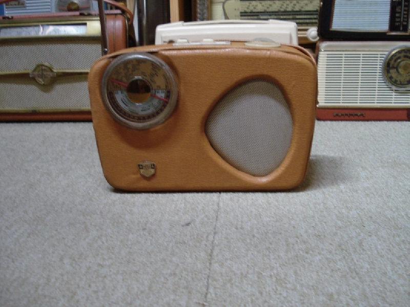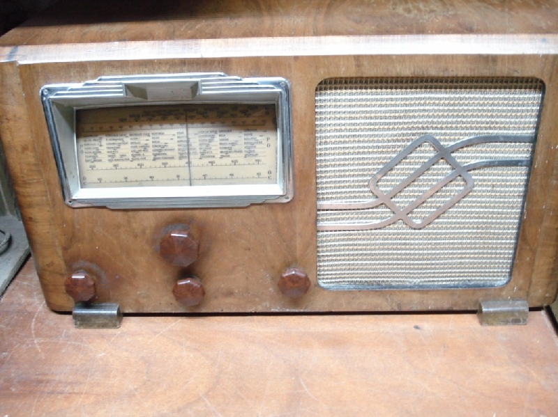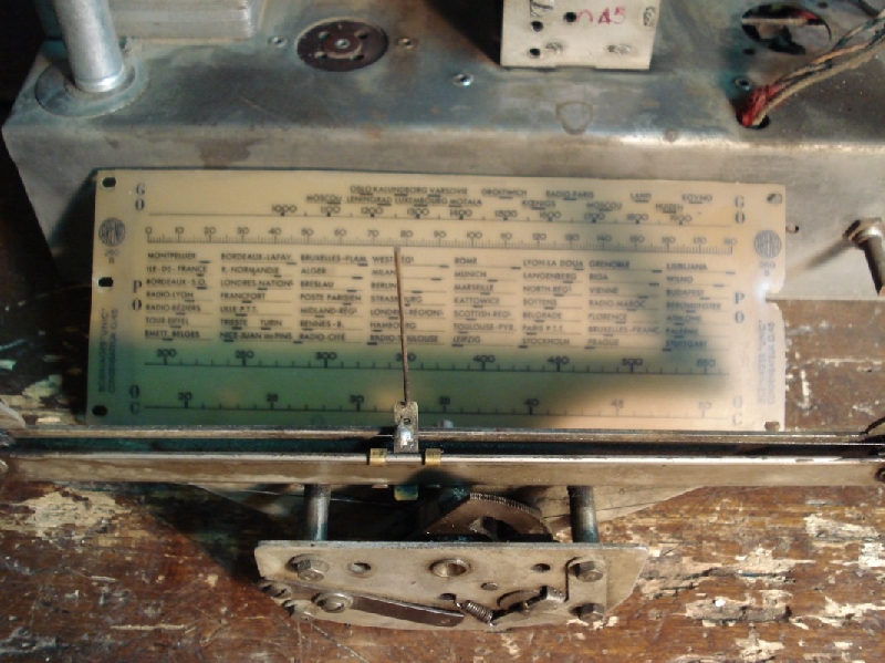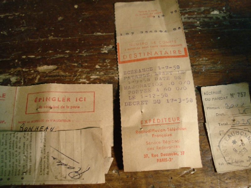 Pour également un tout petit prix ( 5€) il y à celui-là qui me plait beaucoup car je l’'ai trouvé dedans les talons des mandats de paiement de la redevance radio à la RTF des années 1958 et 1959; j’ai donc un poste de modèle mais dont l’auditeur tout au moins pour les années 58 et 59 est connu; il habitait en Seine et Oise et je l’ai acheté le 15/08/2012 à la brocante de Messé dans les Deux- sèvres.Le poste fonctionne toujours parfaitement et sans ronflement seuls les deux chimiques de filtrage sont changés et sont des modèles à vis des années 50. Il est équipé de tubes Américains anciens : 6A7,78, un non identifié mais certainement une 75 puis 42 et enfin 80. Le cadran et le système d’entrainement latéral de l’aiguille sont de marque “ARENA” d’ailleurs ce système d’entraînement devait être l’un des tous premiers utilisés et est digne d’un montage d’horlogerie avec un fin mais solide câble d’acier qui ne risque pas de casser comme les ficelles. Un énorme haut-parleur de marque “AUDIOLA” est monté ; je ne connaissais pas cette marque.