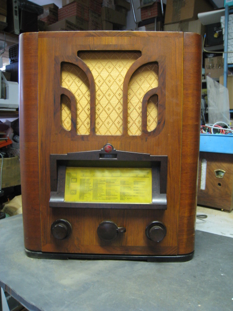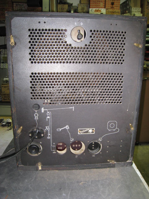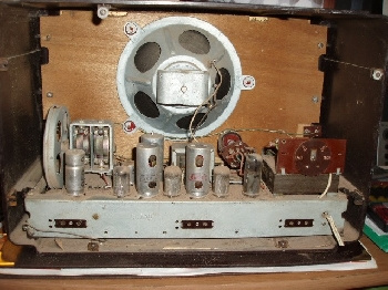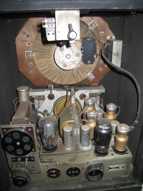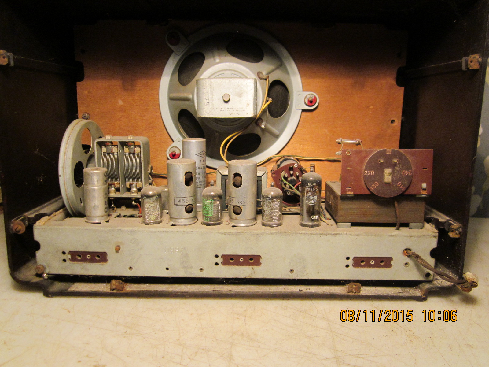 Je n’ aime pas trop les postes avec des lampes en série U , mais bon , semblant complet - sauf son écusson manquant - c’e st assez classique ! - , 4 boutons intacts d’ origine , caisse bakélite bien sale mais pas fêlée , cadran intact et toile en très bon état , avec son carton de dos , 4 vis sur 8 , pas grave …