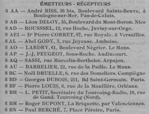 J’ai aussi appris qu’il avait un indicatif 8BN. Je sais qu’il existe des listes de radioamateurs ou il est possible de retrouver le nom et l’adresse de la personne par l’indicatif. Quelqu’un possède-t-il ce genre de liste remontant aux années 20 ?