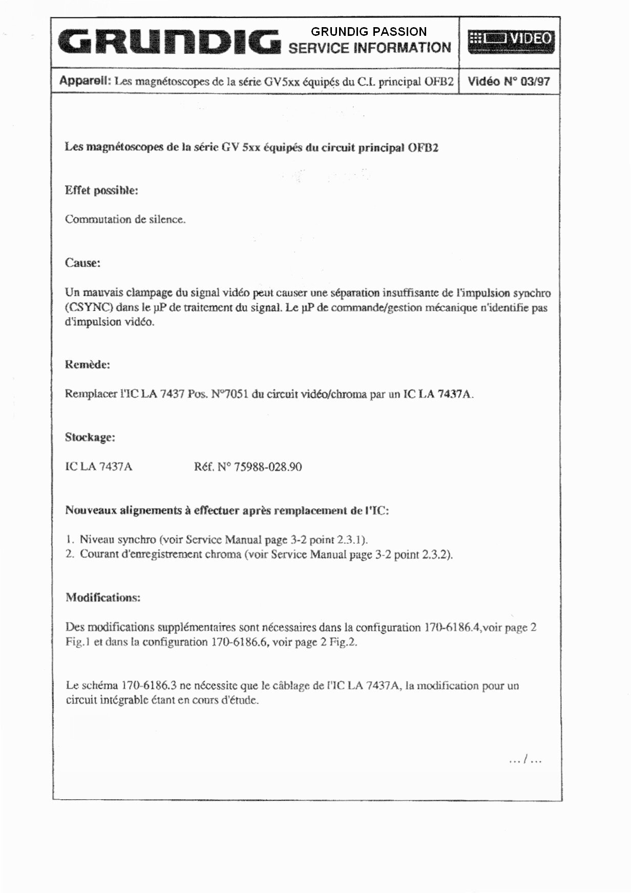 Pire encore, sur les GV 5XX, un clampage défectueux du signal vidéo compromettait la séparation de l’impulsion de synchro (CSYNC) dans le microprocesseur de traitement du signal, provoquant une coupure du son (mute). Le processeur de gestion mécanique ne reconnaissait plus l’impulsion vidéo, nécessitant alors le remplacement de l’IC LA 7437 (7051) du module vidéo Chroma par la version LA 7437A. Différentes interventions étaient requises suivant le module exploité à consulter sur la note technique ci-dessous :