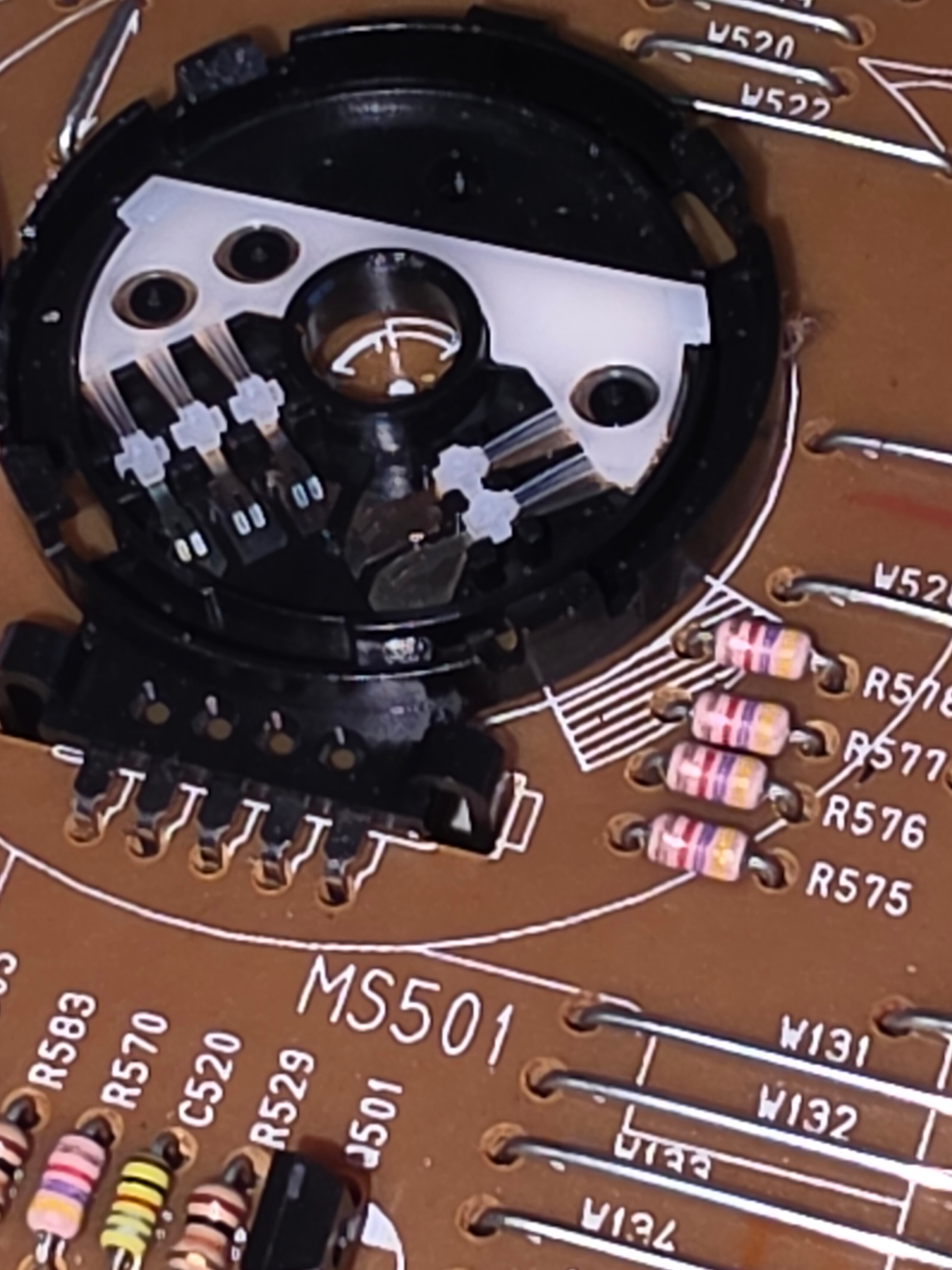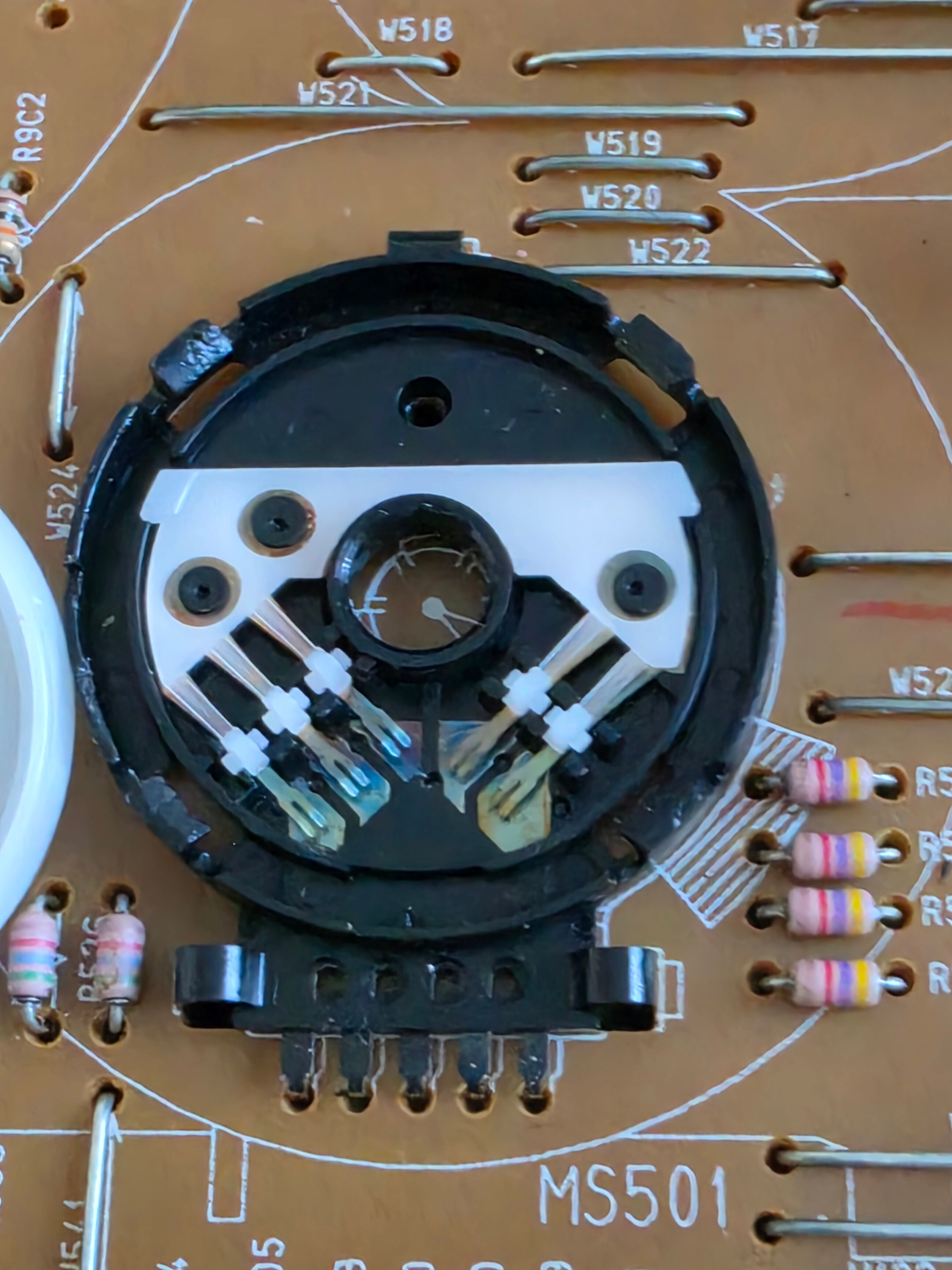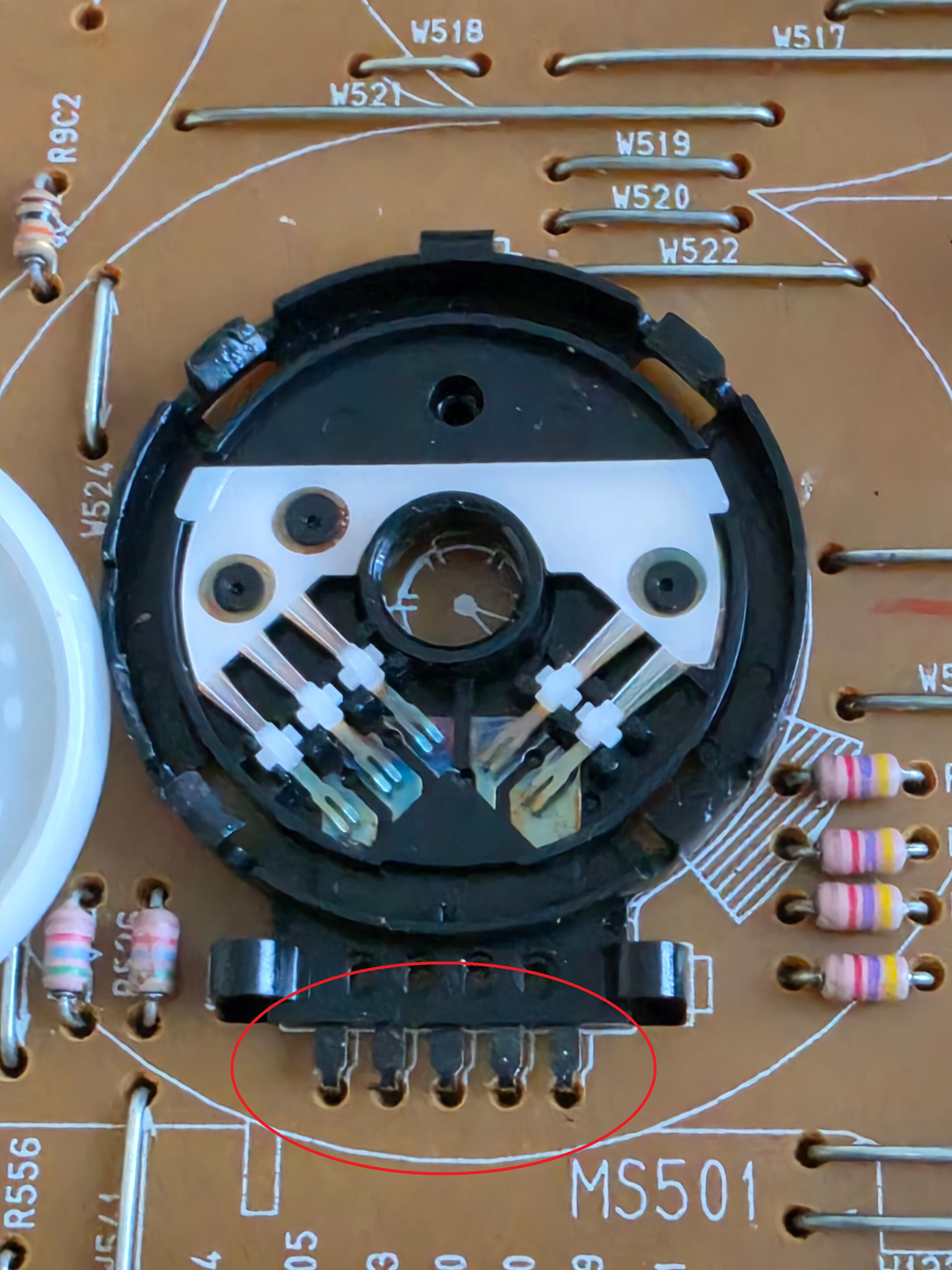 Il est plutot propre à l’intérieur (j’ai déjà vu des m.s entièrement noircis sur des vieux Panasonic) et très oxydé sur les pates soudées à la carte. Grattez tout ça avec un petit couteau / cutter ou brosse + nettoyant contact ou graisse contact elec.