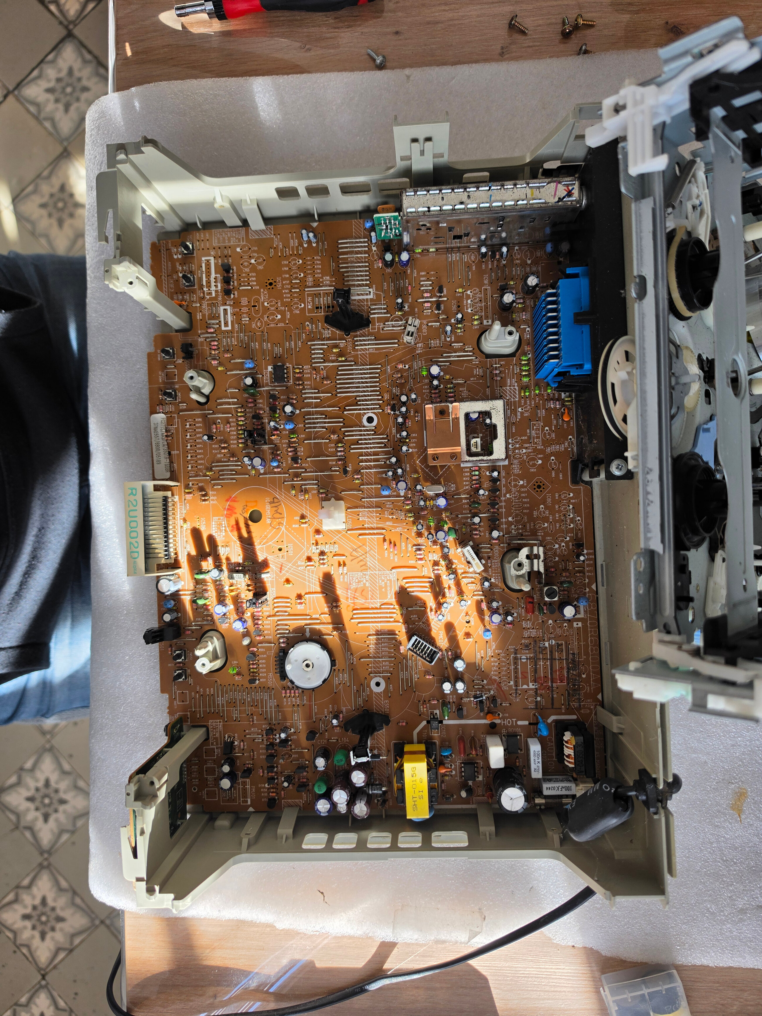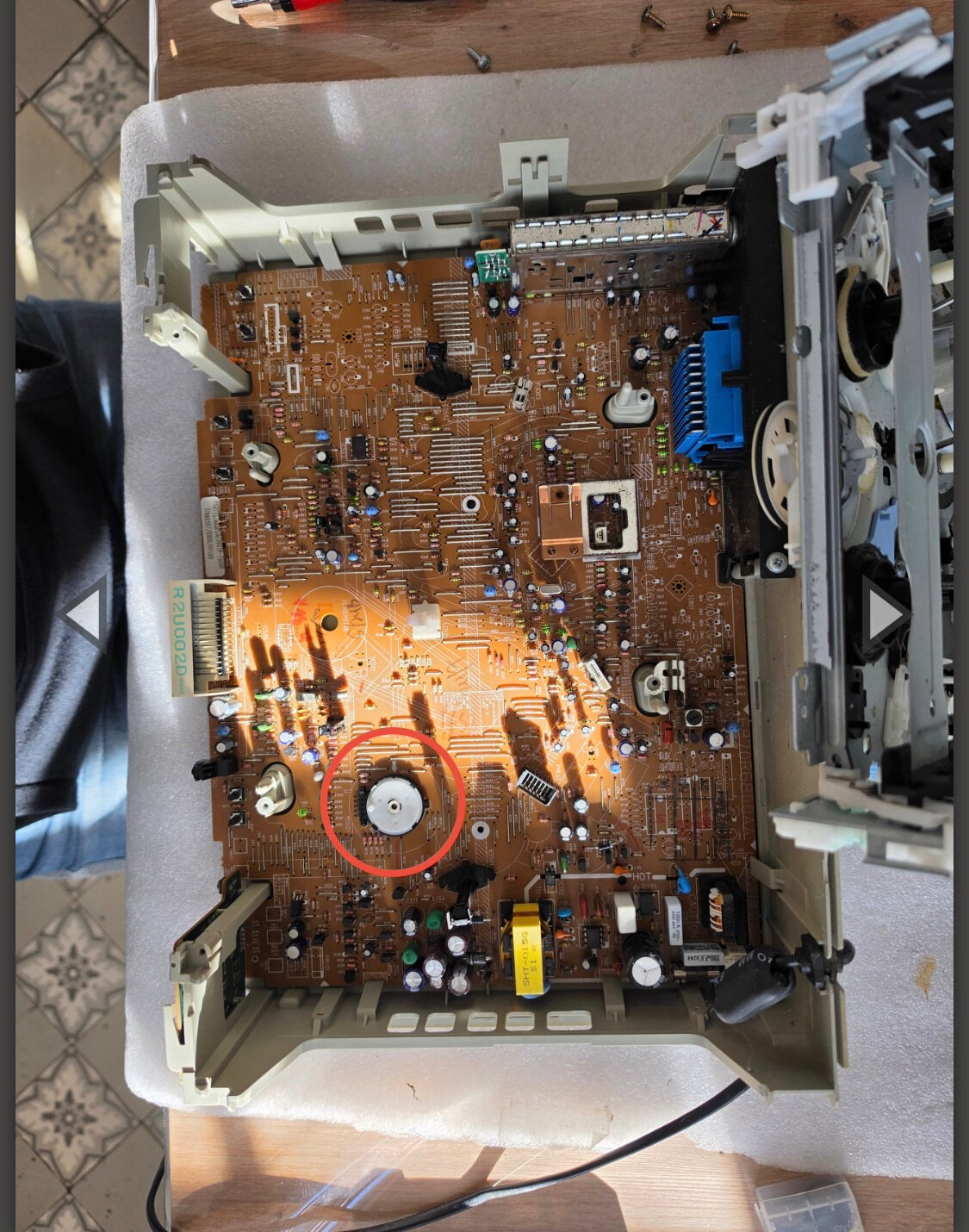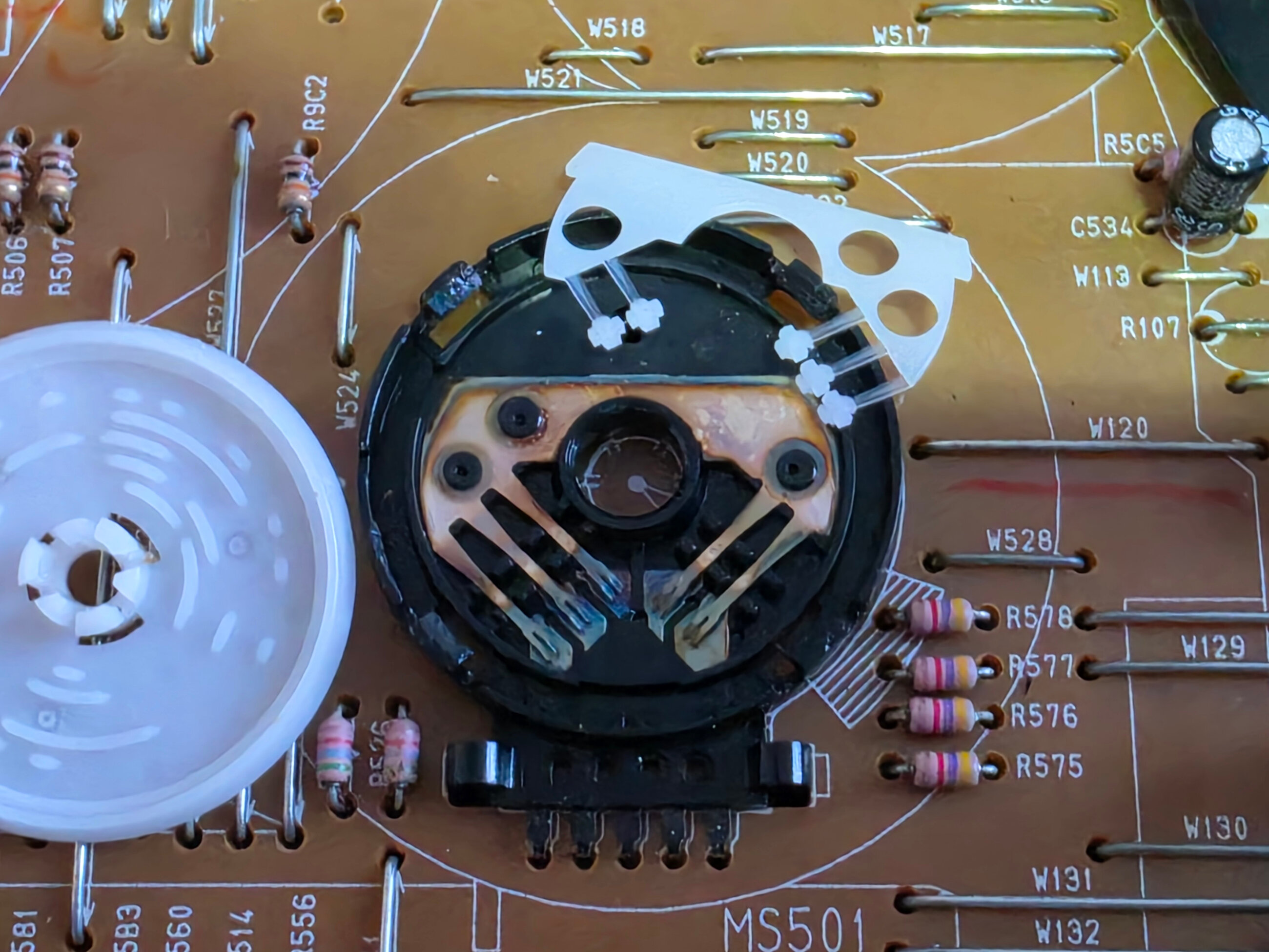 c’était le micro switch (en bas à gauche) qui détecte si la cassette peut être enregistrée, qui sert aussi à détecter l’insertion de la cassette. Il ne commutait plus, je lui ai mis de la bombe à contact et c’était reparti.