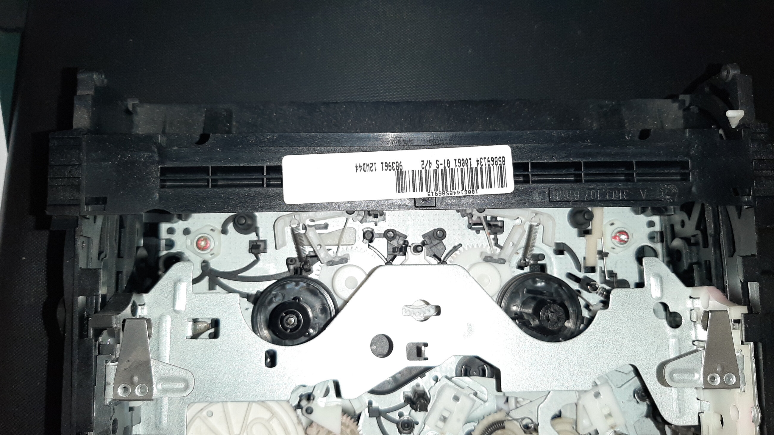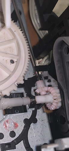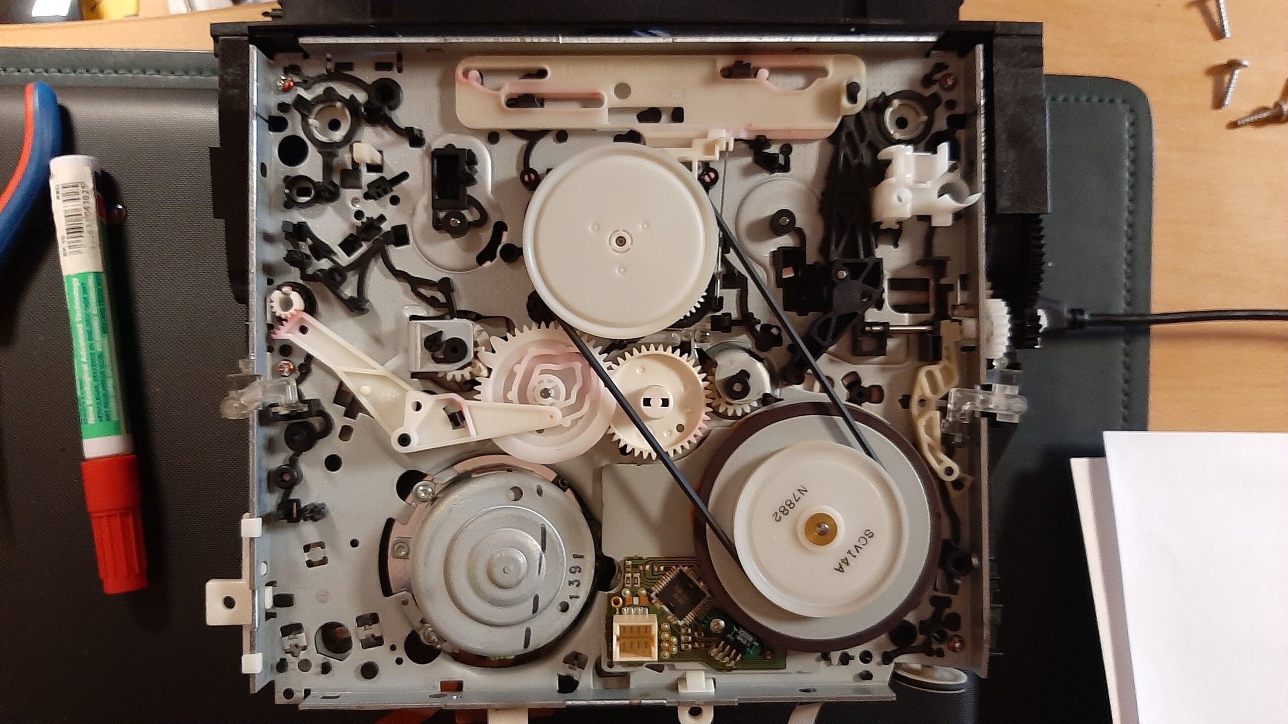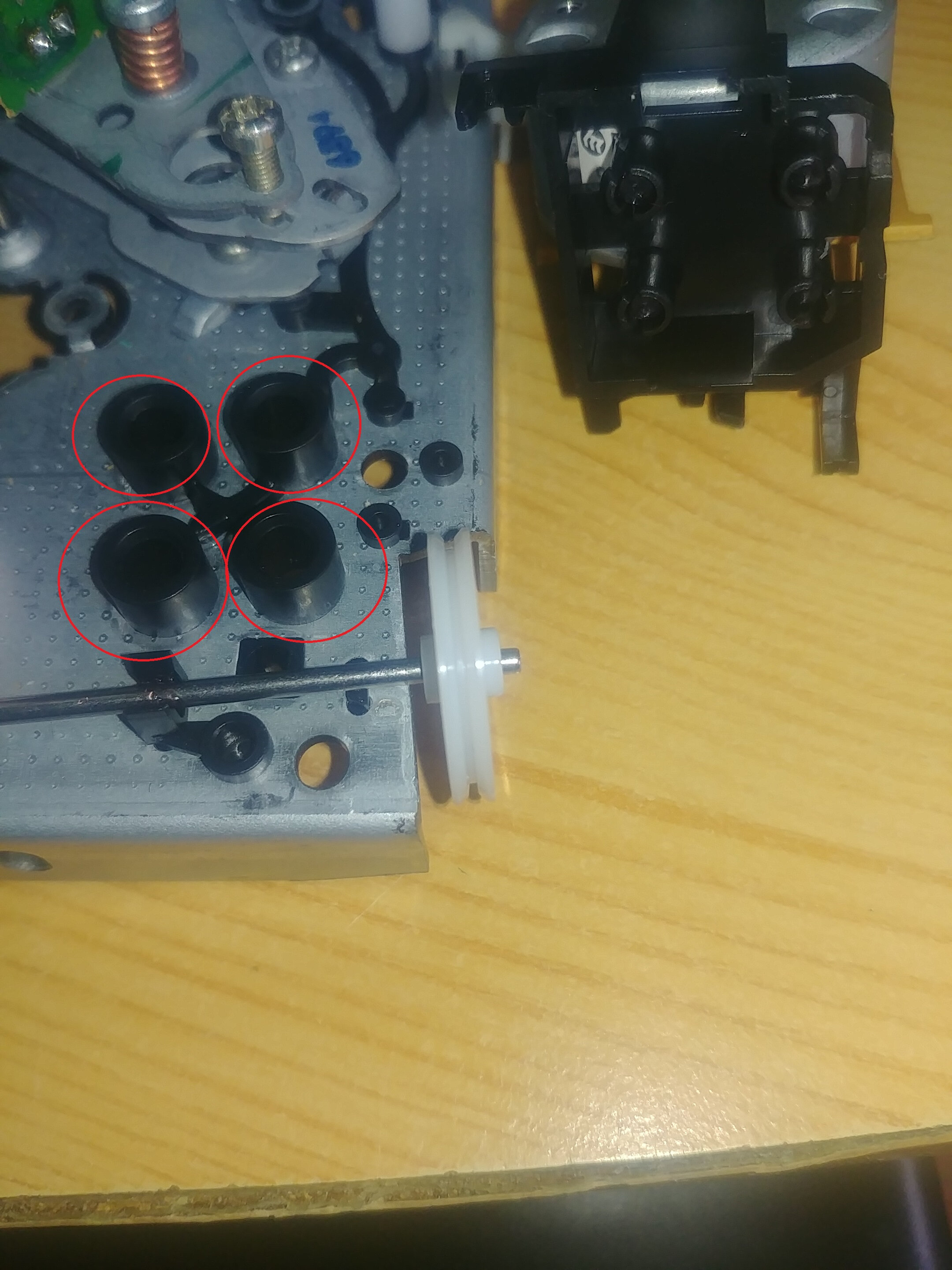 Ensuite pour arriver au fameux « worm kit » (soit c’est la longue barre qui casse le « worm shaft » ou alors la poulie « pulley shaft ») il faut démonter le moteur de chargement sinon impossible il y a 4 pins en plastique qu’il faut faire sauter. pour finir le compartiment cassette évidemment (4 petites vis je pense)