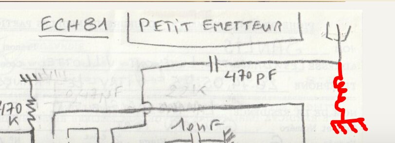 Avec ce morceau de fil rouge d’un mètre, on capte bien à l’autre bout de la maison et tout çà avec une seule ECH81.