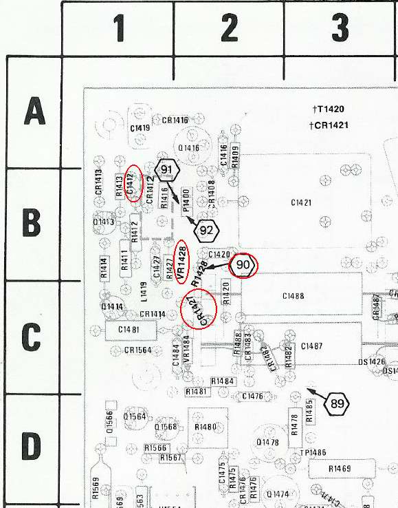 quand j’ai récupéré cet oscillo, la résistance 1428 était déja dessoudée d’un coté, et je ne sais pas pourquoi, alors est ce que la cr1427 n’a pas été enlevée, mystère