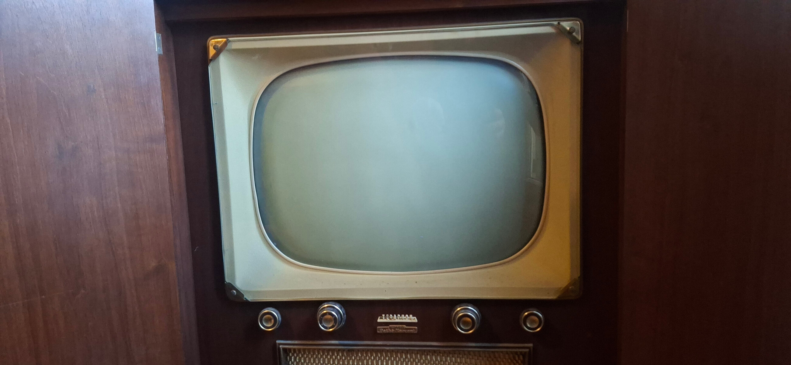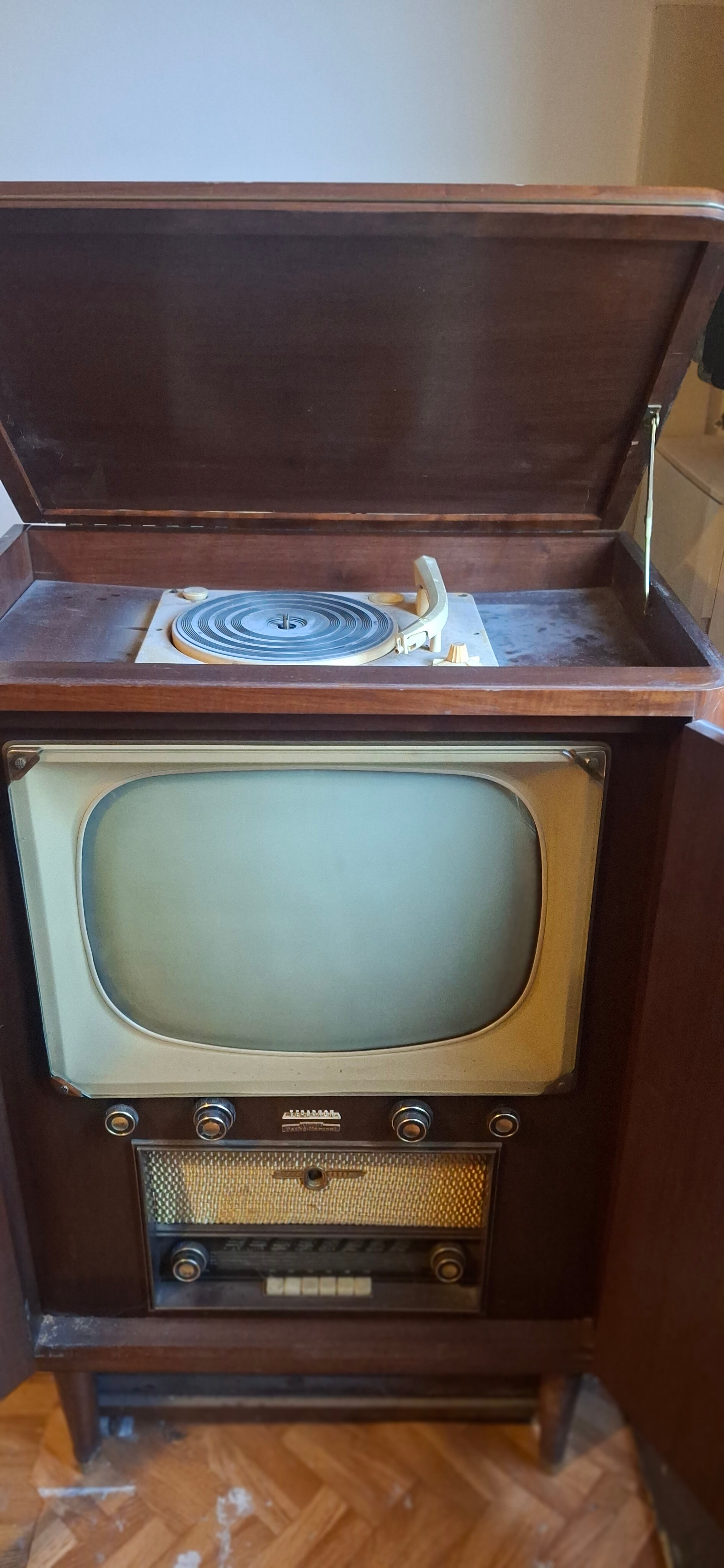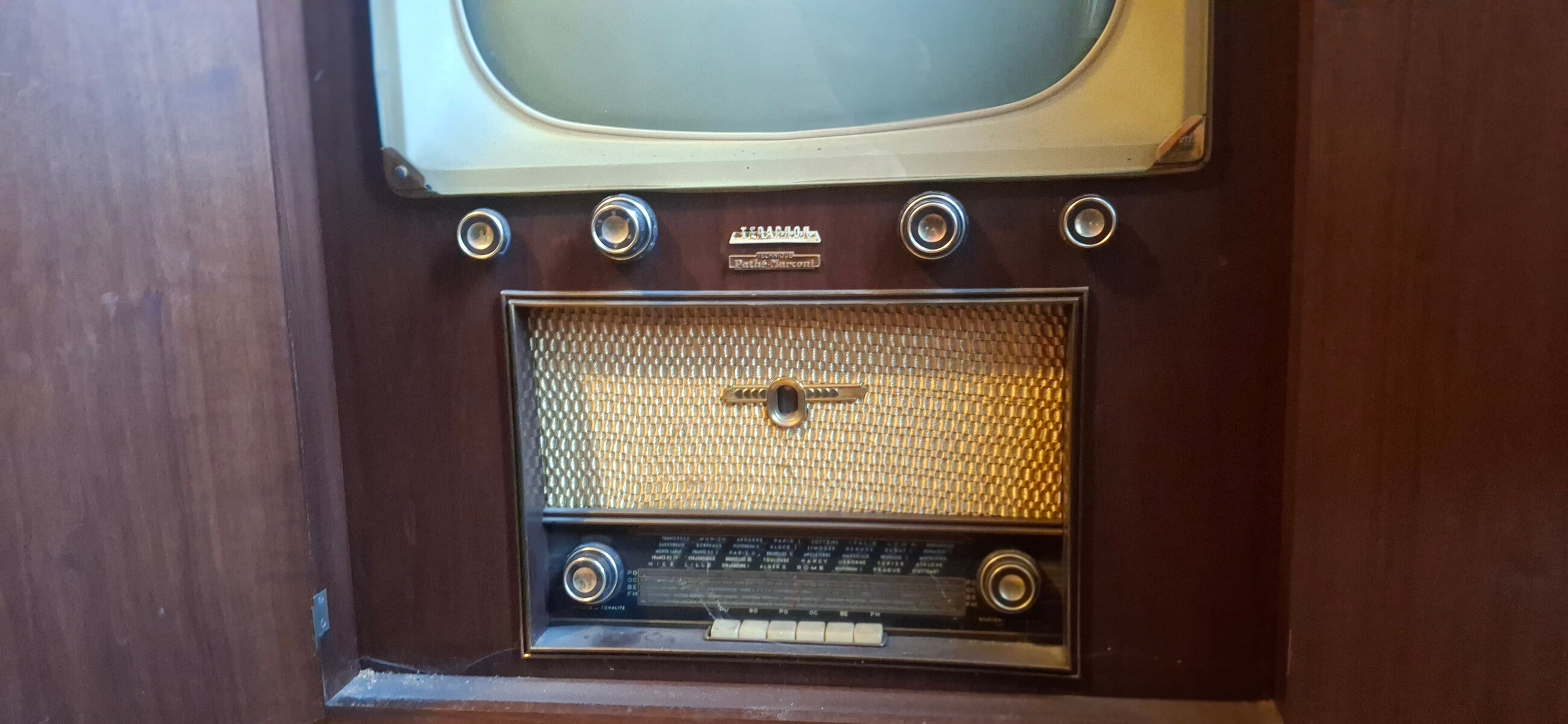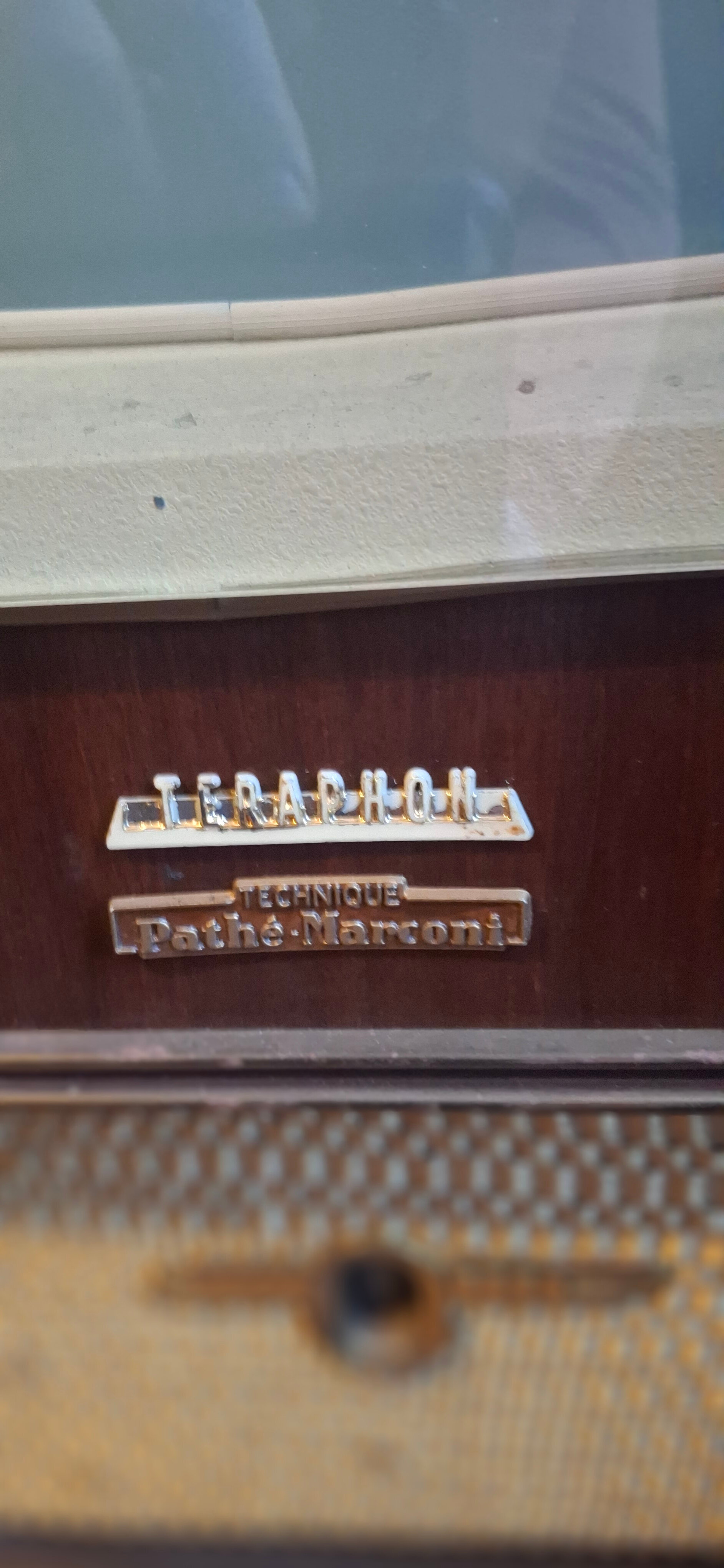 J’ai récupéré il y a quelques années ce meuble television, PU, TSF, de marque « Teraphon, système Pathé Marconi », très probablement de la fin des années 50. Il semble complet et visuellement en bon état mais j’ignore s’il fonctionne : étant incompétent et prudent, je n’ai évidemment pas tenté de l’alimenter !