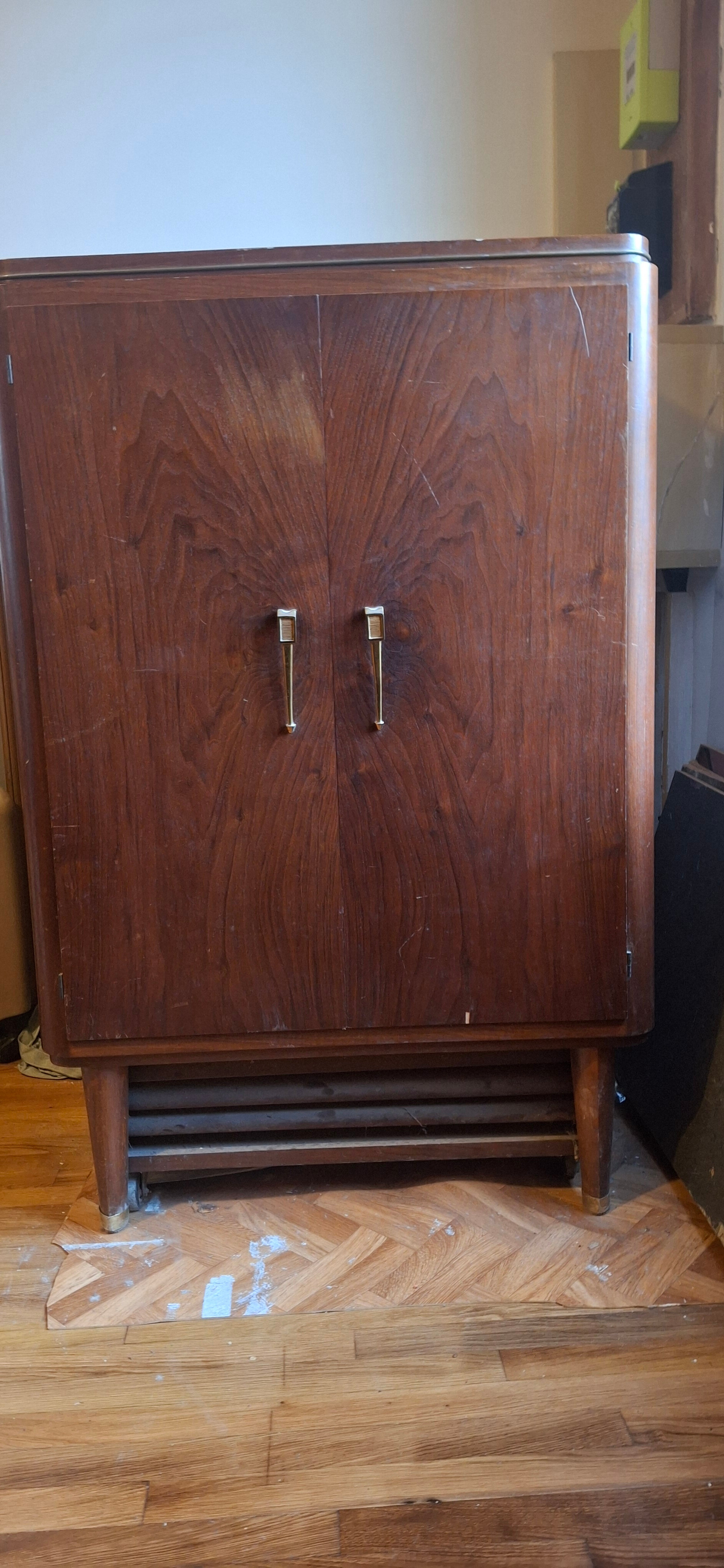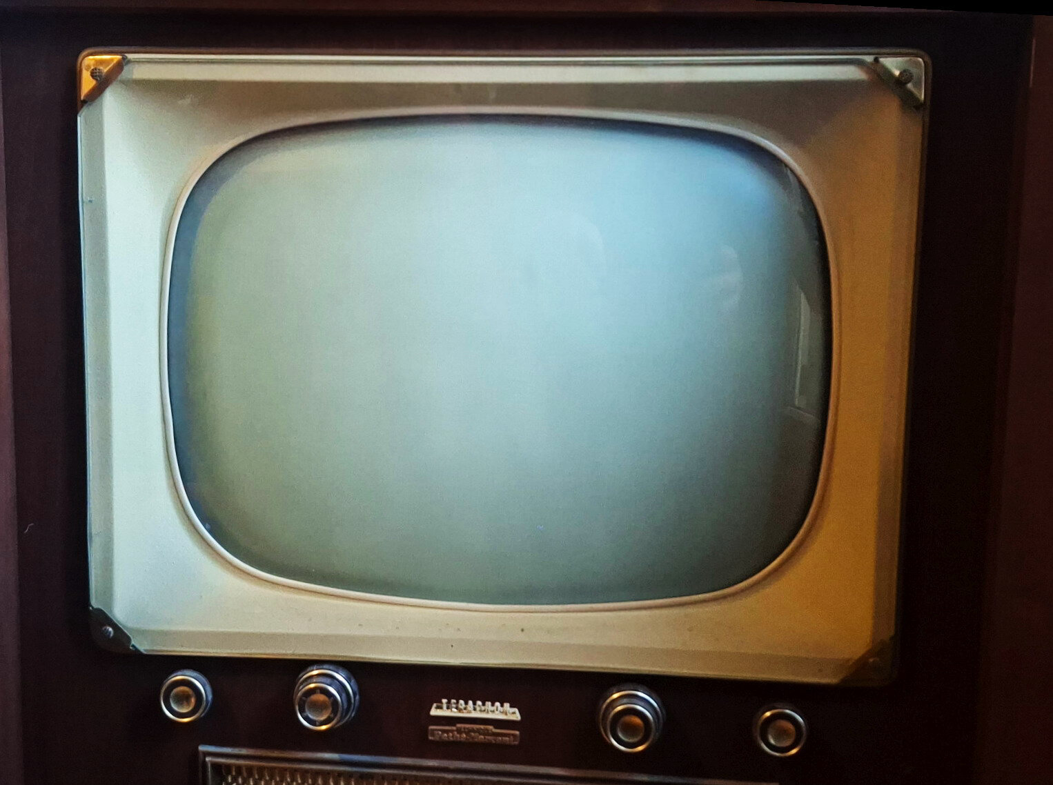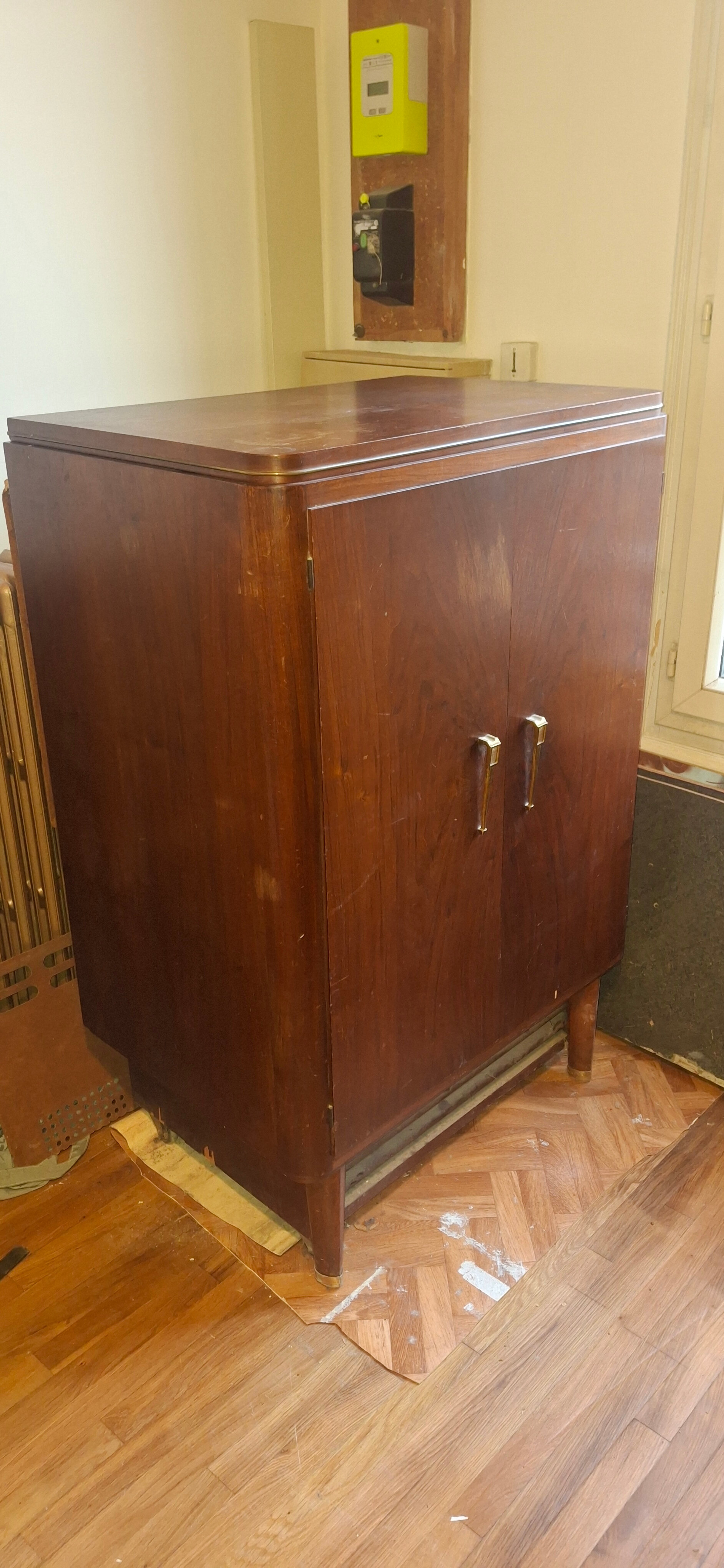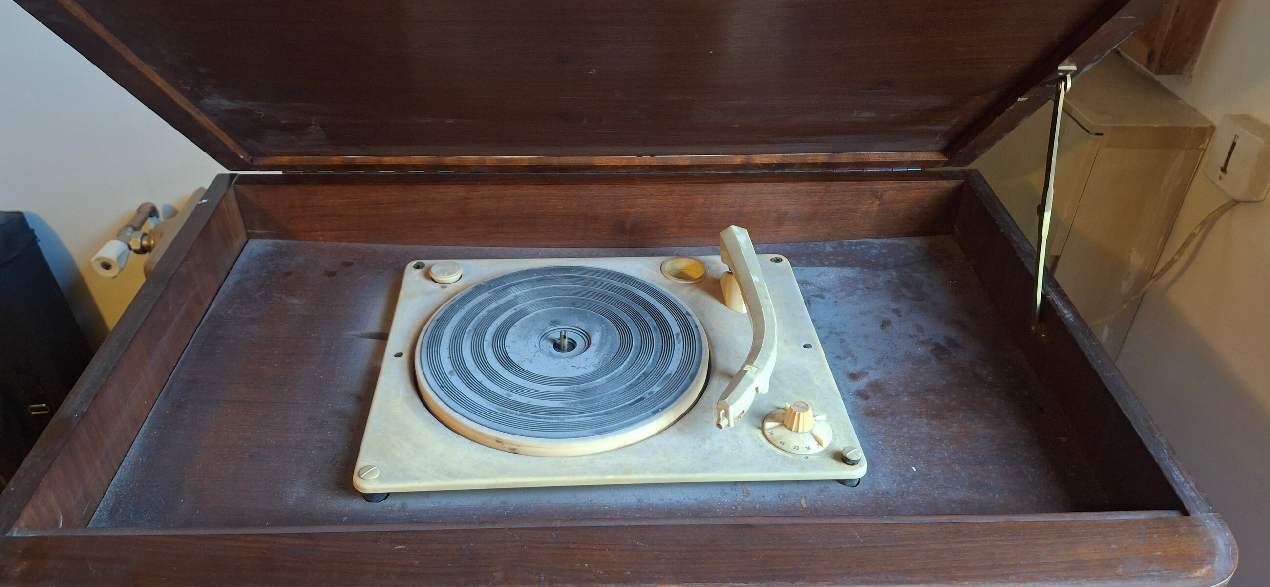J’ai récupéré il y a quelques années ce meuble television, PU, TSF, de marque « Teraphon, système Pathé Marconi », très probablement de la fin des années 50. Il semble complet et visuellement en bon état mais j’ignore s’il fonctionne : étant incompétent et prudent, je n’ai évidemment pas tenté de l’alimenter !