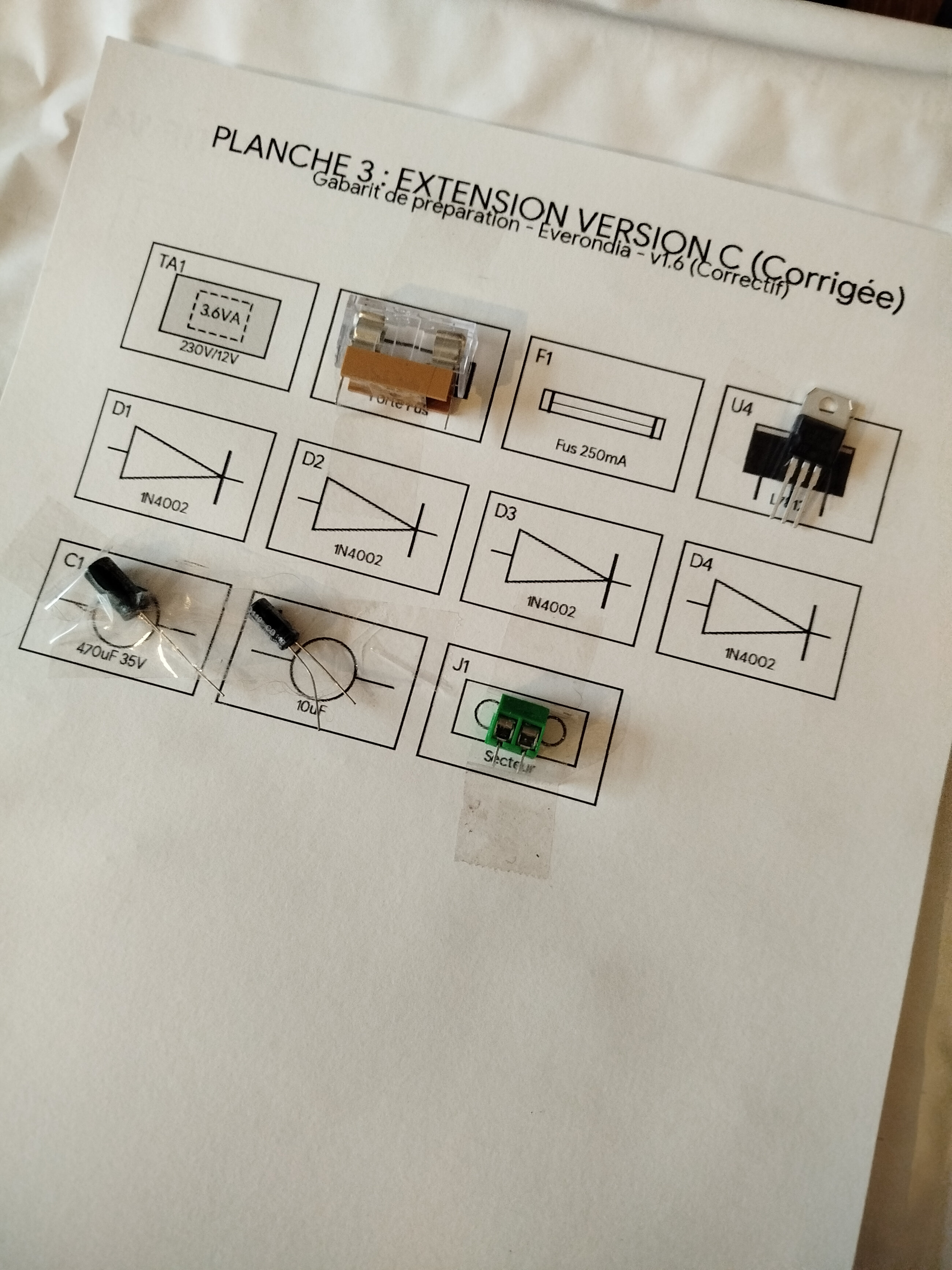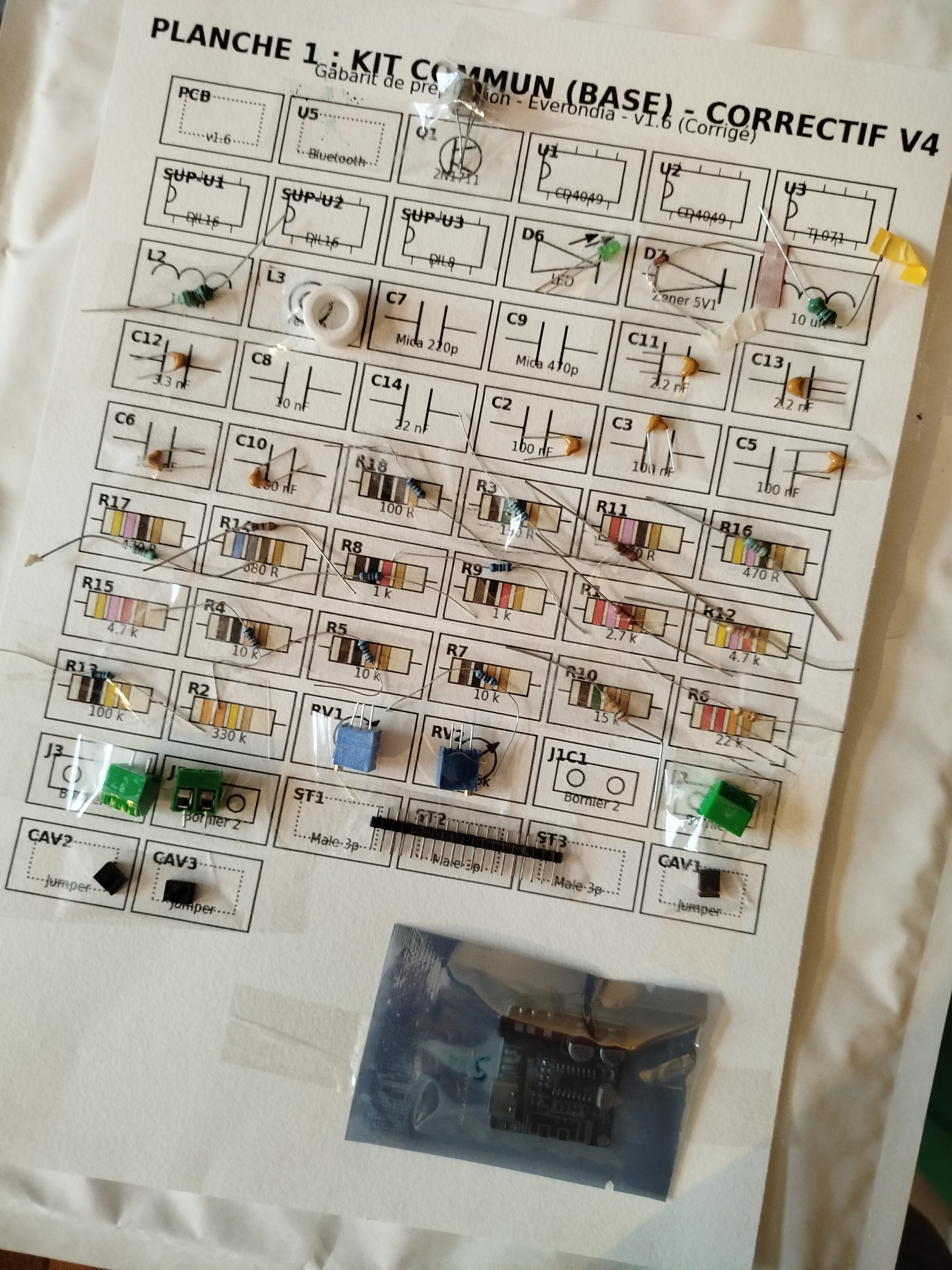 Le kit est livré sur une feuille cartonnée avec les composants collés dessus ce qui évite les erreurs, oublis, et qui facilite grandement la lecture des composants.