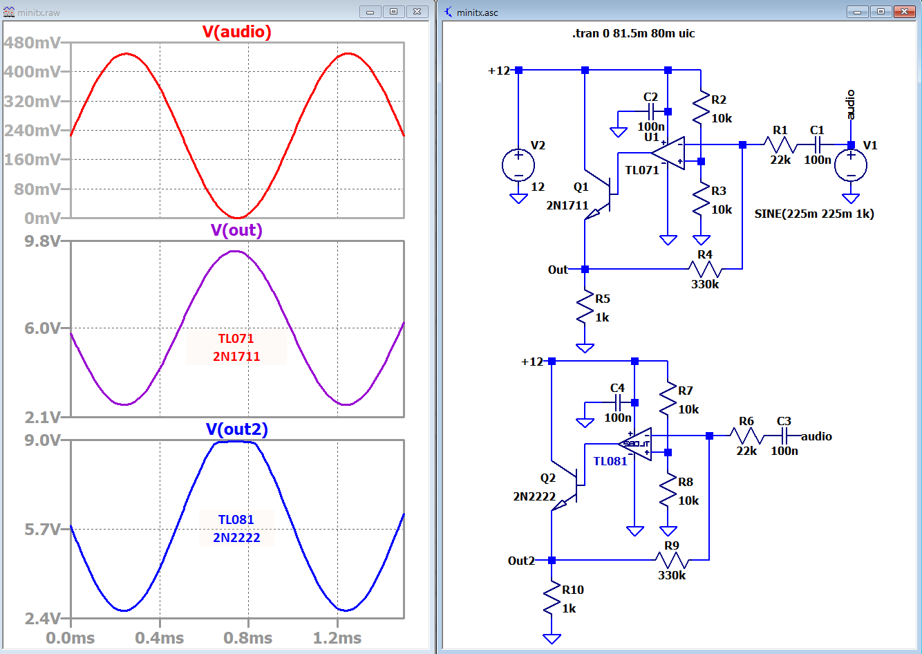 J’ai simulé les 2 options en simultané avec un signal sinus de 450mV en entrée.