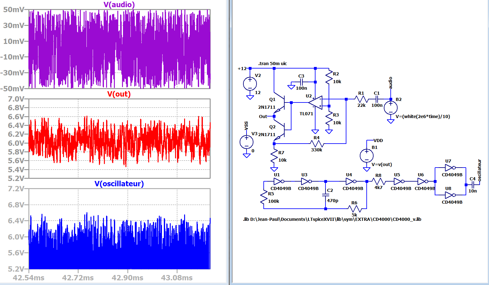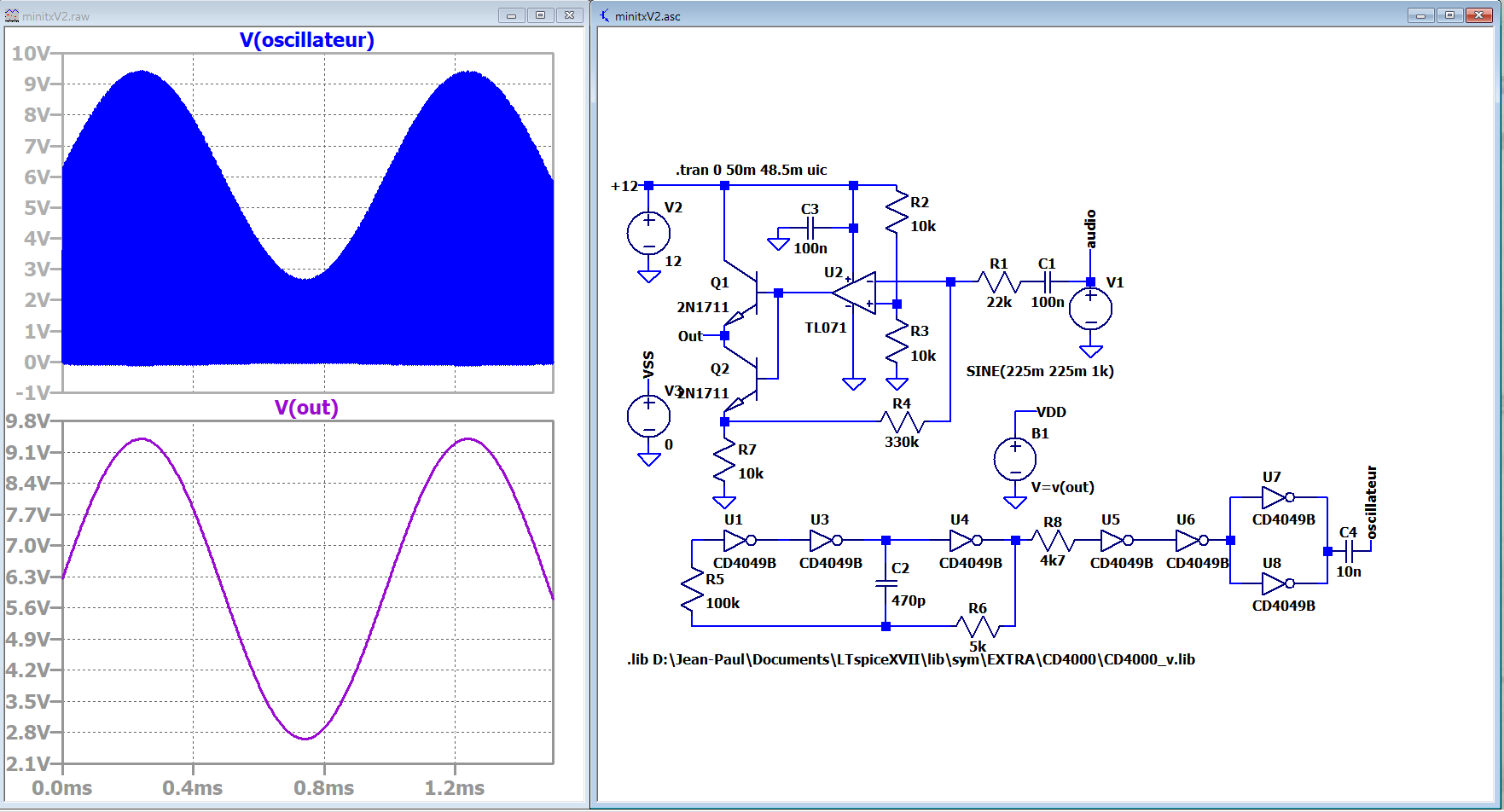 Ne pas tenir compte des sources de tension V3 et B1 qui ne sont là que pour la modification des CD4049B afin qu’il puissent être alimentés avec le signal sinus « Out »