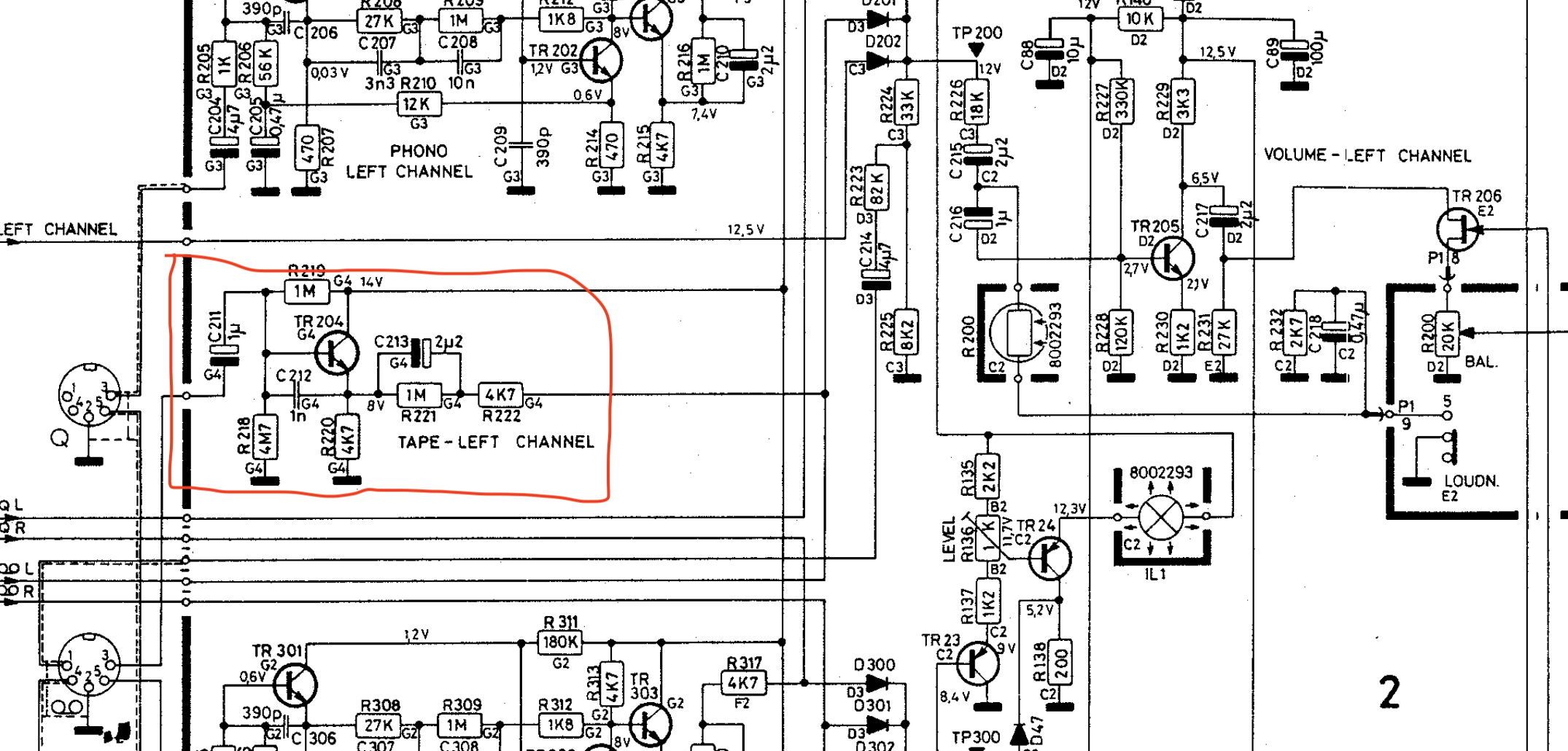 Bonjour, tu peux booster le gain de TR205 (et TR305) en remplacent R230 par deux résistances de 560 ohms en série , et tu découple la résistance du bas (celle qui est a la masse) par un condo de 22µF (22 à 47µF) en //.