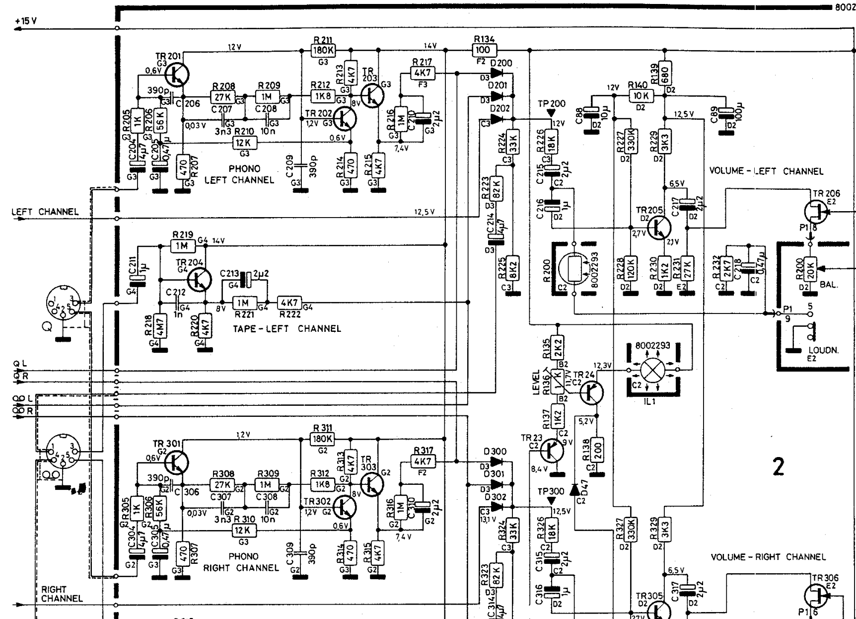 Après R 4K7, on arrive sur des « diodes », qui sont , à mon avis, des switchs, il n’ y a pas de sélecteur mecanique, et à la sortie des ces « diodes », on à un tronc commun, volume ( pas mécanique non plus), et balance.., les entrées "left/right channel viennent du tuner.