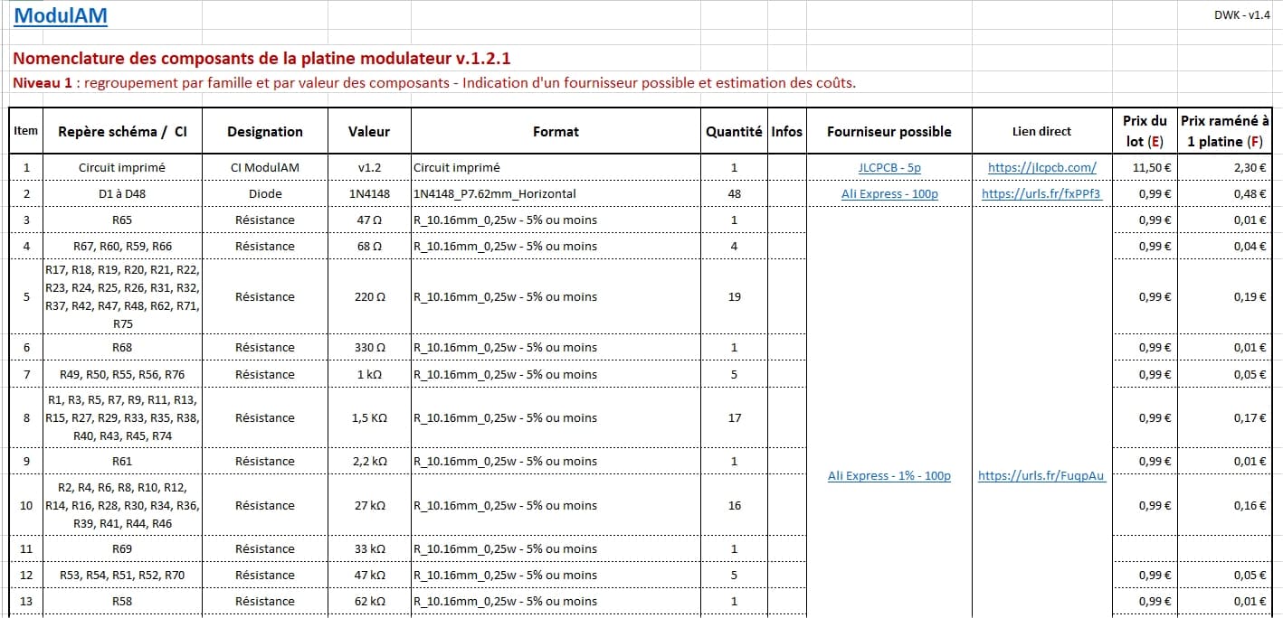 Niveau 1 : nomenclature générale des composants classés par famille et par valeur avec liens vers un fournisseur possible et un prix indicatif pour chaque composant.