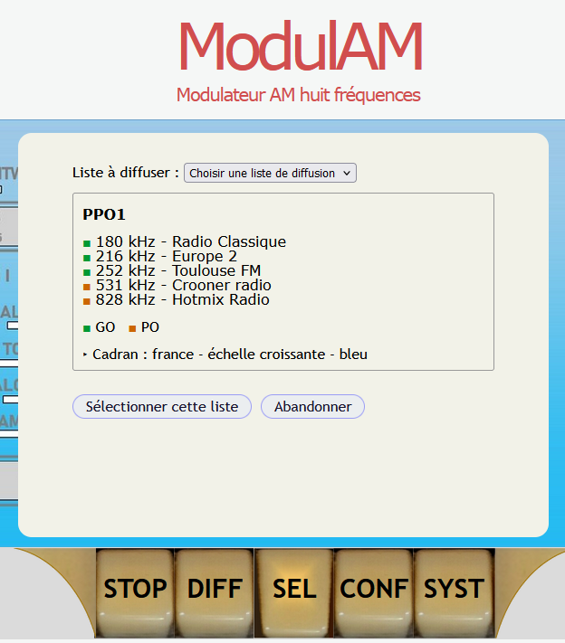 Remarque d’accessibilité : je suis daltonien, et je vois très mal la différence de couleur sur l’écran ci-dessous entre les stations PO et GO. Vous me direz : suffit de lire la fréquence, c’est vrai, mais tant qu’à avoir prévu de différencier visuellement les 2 gammes, autant que ce soit visible par tout le monde. La solution consiste à différencier les formes des pictos colorés (et pas uniquement la couleur) : garder par ex la forme carrée pour les PO et utiliser une autre forme (disque, losange…) pour les GO. Merci d’avance pour les deutéranopes, protanopes et les tritanopes !