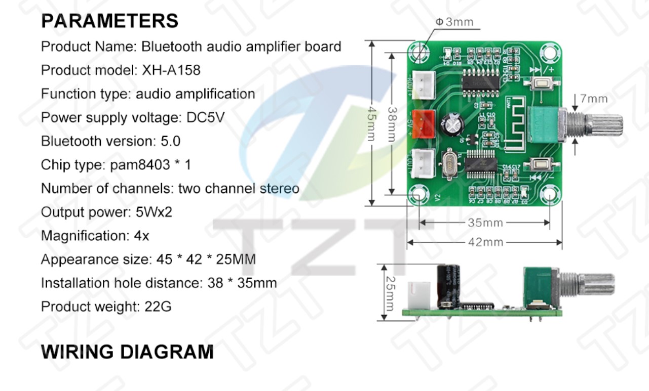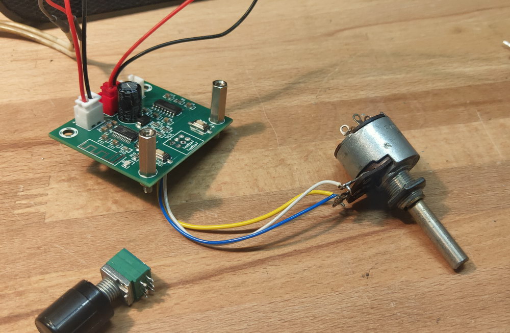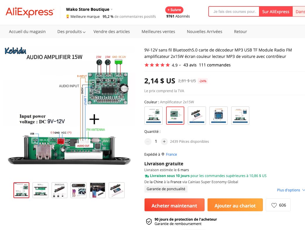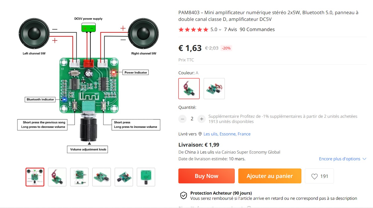 Pour rester dans le sujet, voici un module bon marché qui fait bien le travail, il est équipé d’une puce PAM8403 pour l’amplification, de 2 X 3W, et d’un récepteur Bluetooth