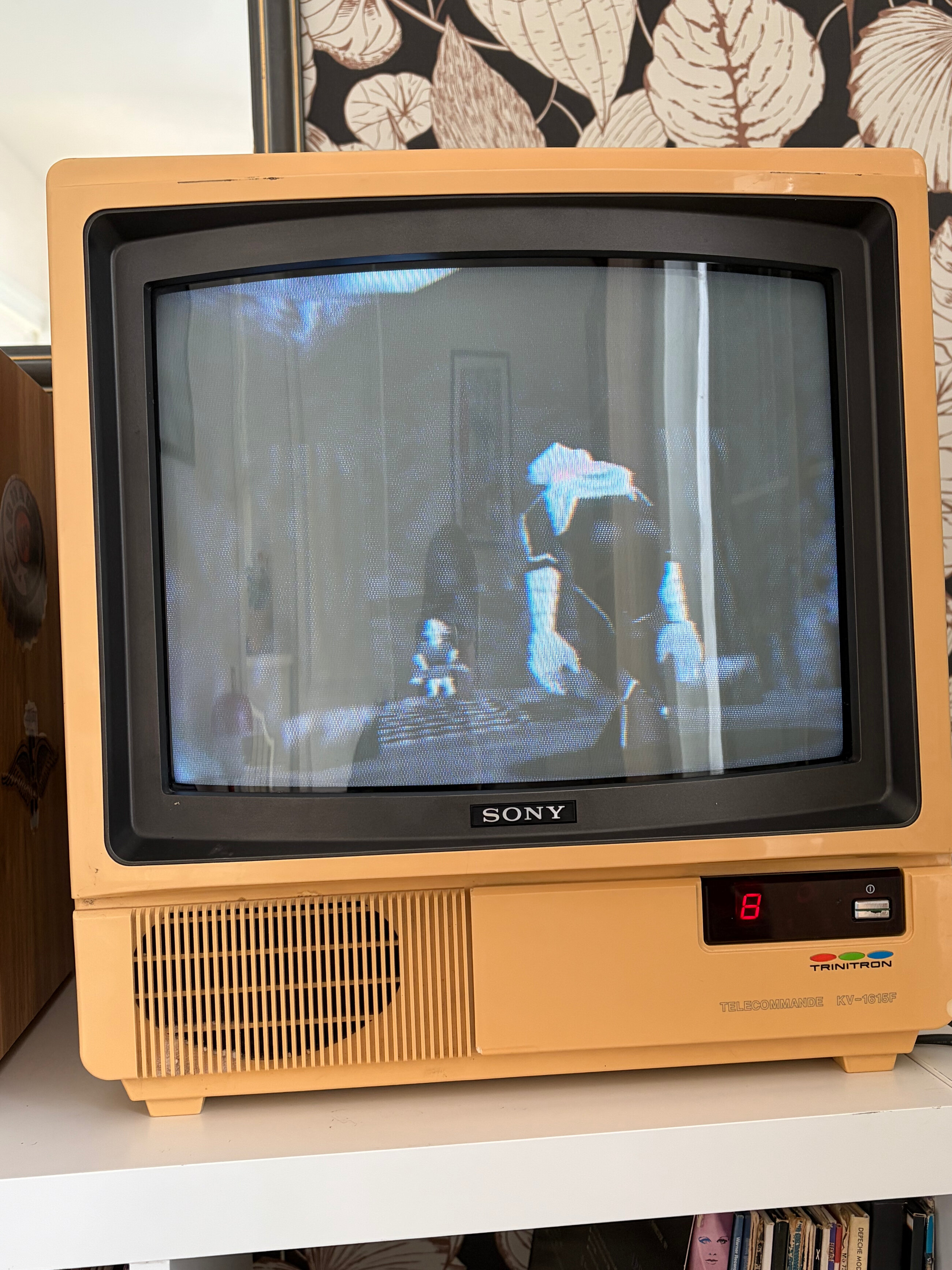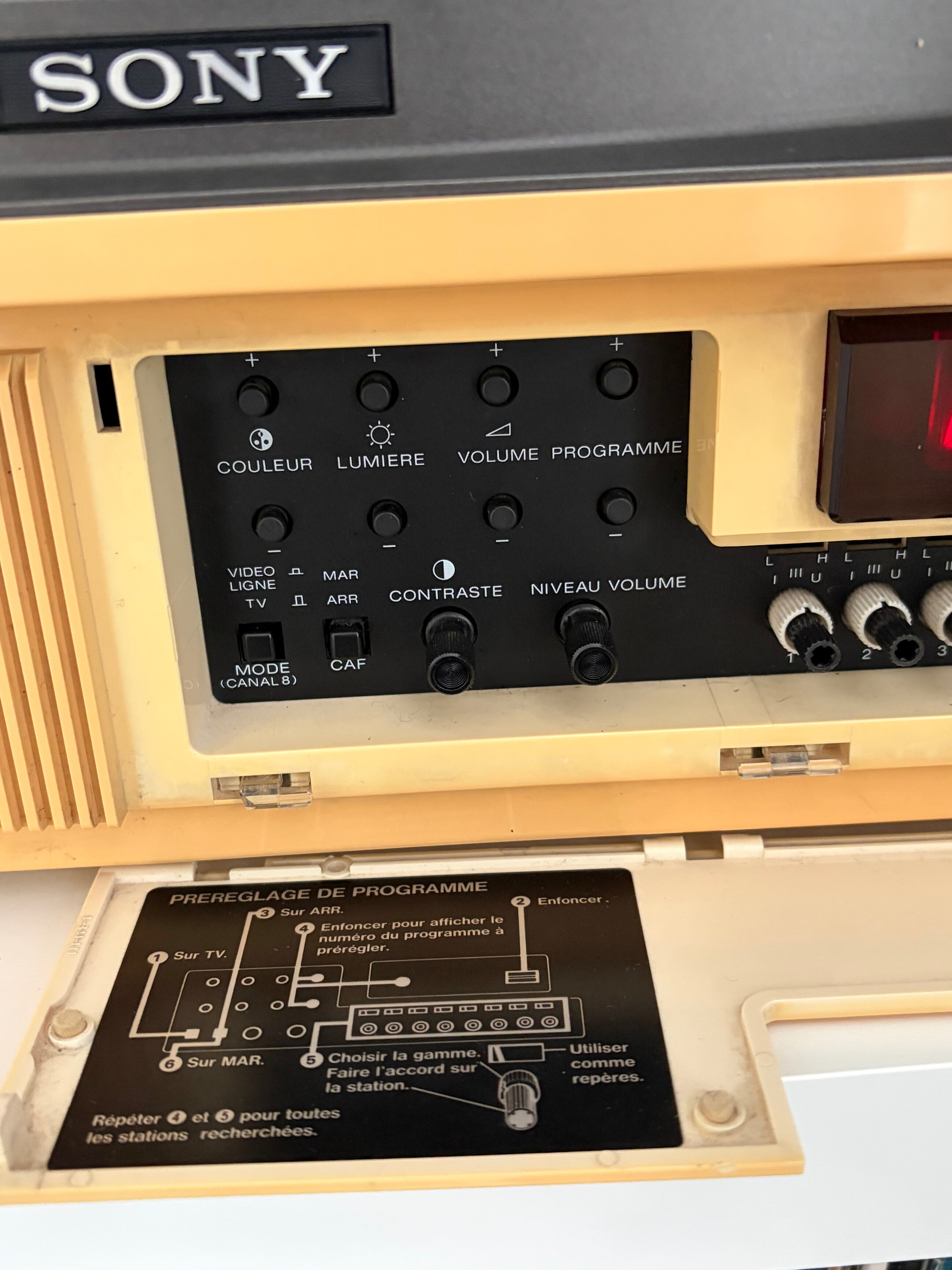 Ce tv Sony du debut des années 80 est Secam LL’, donc il ne gère pas le PAL en peritel d’où l’image en noir et blanc en mode audiovisuel (peritel commutation forcée AV ou sur présélection 8).