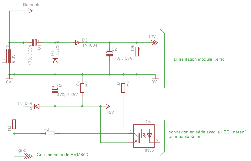 J’ai aussi dessiné un fusible de faible valeur en série avec le « piquage » sur le 6,3V pour alimenter ceci : c’est pas inutile vu le courant de court-circuit que peut débiter un enroulement de chauffage ! Un fusible 50 ou 100mA retardé est ok.