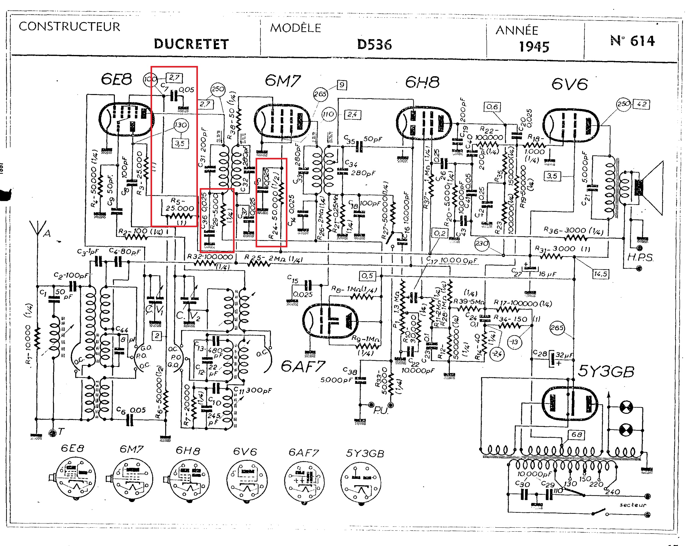Le schéma que je vous propose contient 3 tubes qui sont utilisés sur votre poste. J’ai encadré ce qui faut vérifier. J’ai eu un problème similaire au votre. En faisant un découplage individuel des tubes 6E8 6M7 comme mentionné sur le schéma, le problème avait disparu.