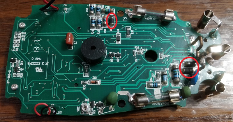 Bon, avec les symptômes, probablement mort. Mais le circuit de protection peut être en court-circuit. Varistance (composant bleu) et les composants verts peut-être, je ne sais plus ce que c’est en général (CTN ?). Mort pour mort, faire l’essai en les enlevant simplement (au moins la varistance, regarder comment sont câblés les autres). Mais vu le prix de ces multimètres, ce n’est pas un grosse perte et il ne faut pas y passer des heures.