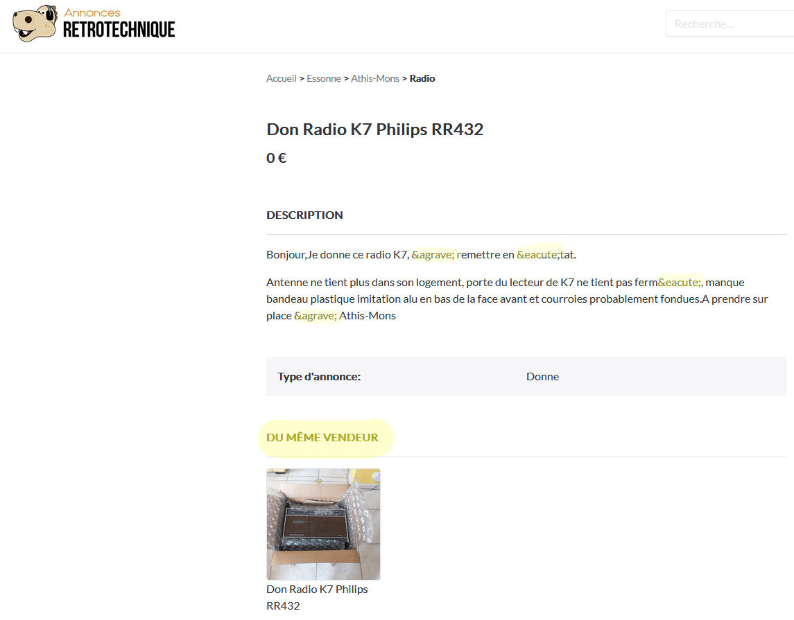 Exemple sur annonce Don Radio K7 Philips RR432 - Petites Annonces Rétrotechnique