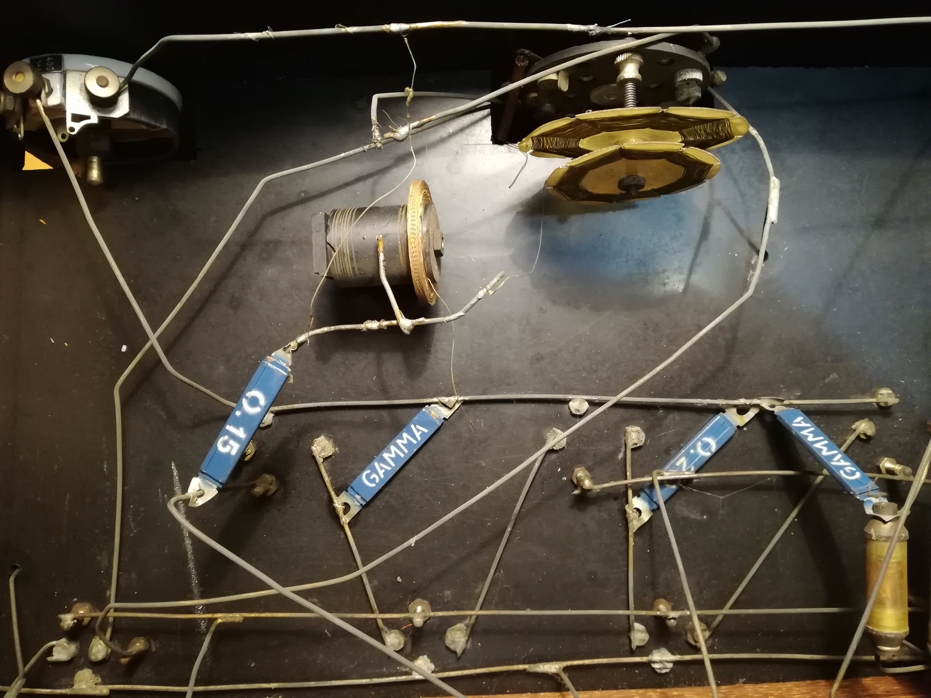 J’ai bien consulté le site de JCJ et parcouru le bouquin que vous m’aviez indiqué. J’avais donc en tête le schéma de ce type de récepteur ; je voulais cependant avoir confirmation que les 2 fonds de paniers couplés étaient les bobines de l’oscillateur PO et l’autre l’oscillateur GO. J’ai été dérouté par cet ensemble de pièces hétéroclite, ce qui signe une réalisation d’amateur, au demeurant pas très méticuleux, et peut-être peu fortuné. Curieusement, les pièces (CV, transfos MF) ne sont pas marquées ; était-ce courant à l’époque?