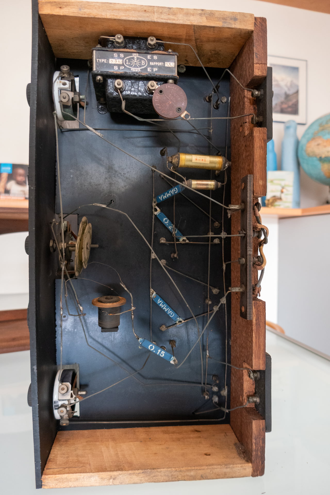 Sur la photo, on voit les bobinages, qui sont ceux de l’oscillateur local, puisque ce poste fonctionne sur cadre. Presque tous les fils sont coupés ou dessoudés : derrière le commutateur, 2 fonds de panier. A coté, une bobine unique avec 1 prise.
