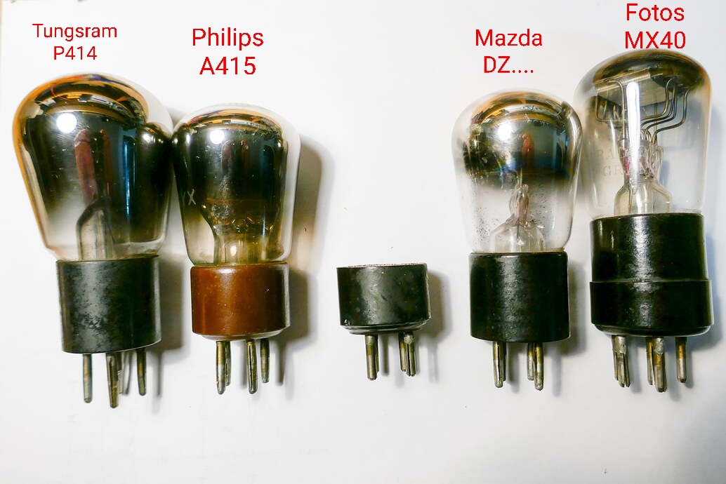Mazda DZ2222 (seuls la marque et le nombre 2222 sont lisibles sur le tube), DZ2222, A415 (et non 416 comme j’avais (mal) lu), et Tunsgram P414 (seules les lettres TU sont lisibles).