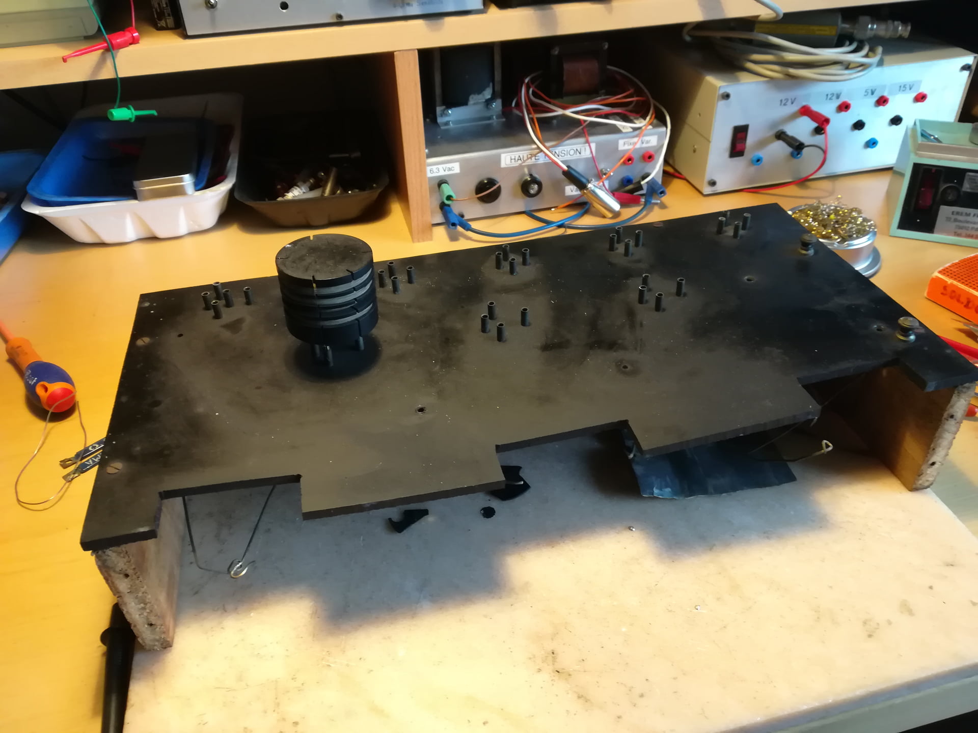 J’ai totalement démonté le poste pour tenter de redresser la face avant et la châssis en ébonite, tous deus assez fortement voilés.