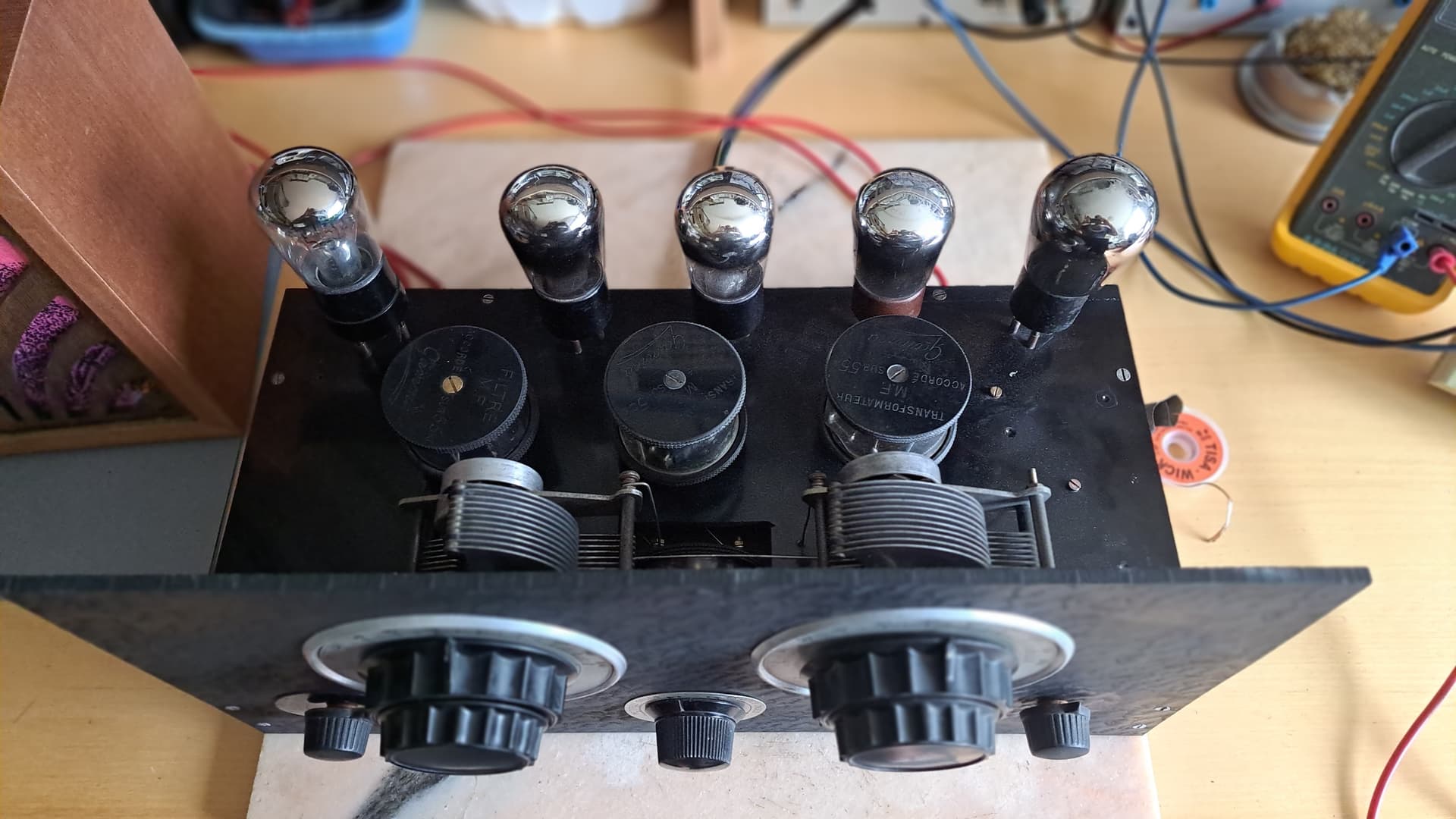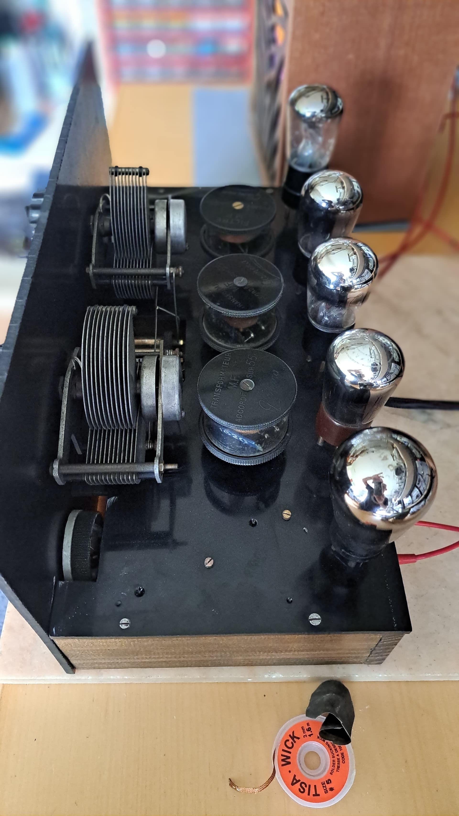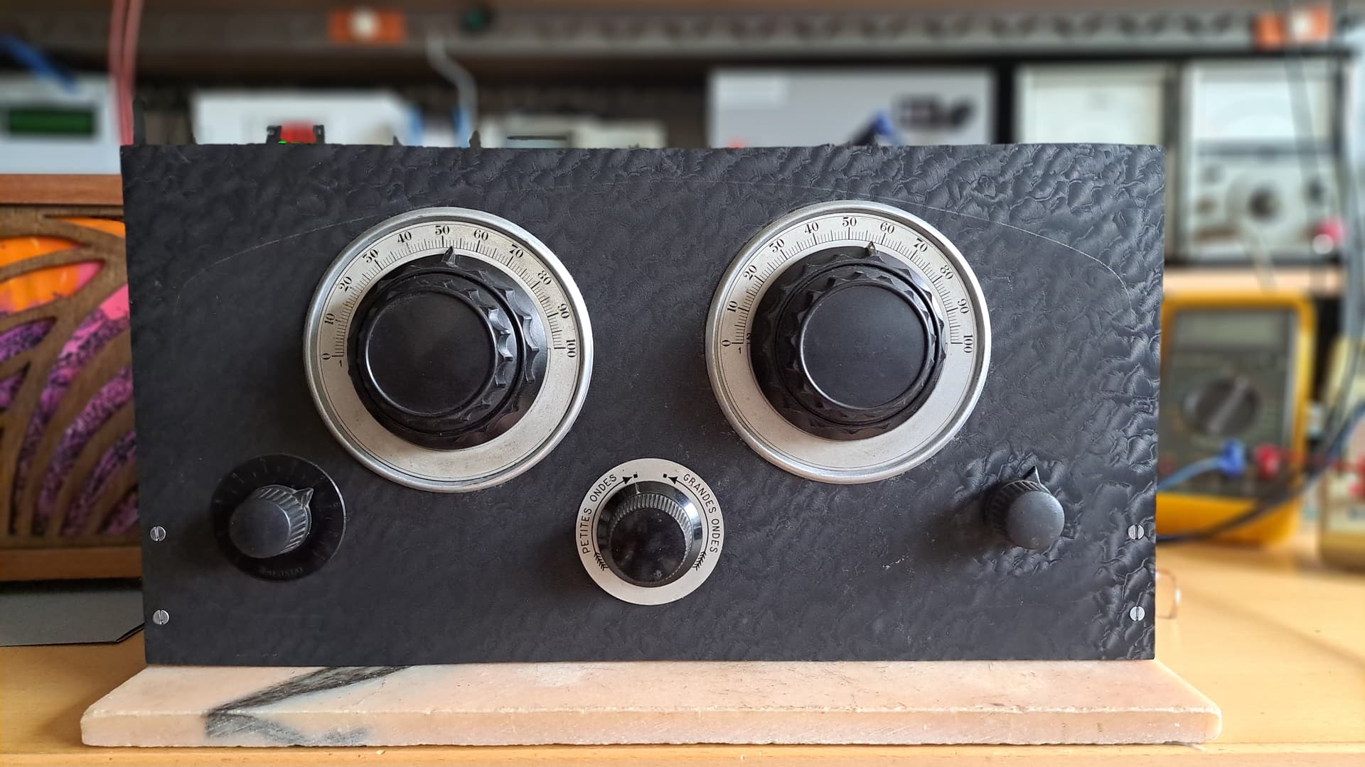 Ce poste de construction amateur, pas très bien câblé (certaines connexions soudées, d’autre vissées), avec des composants de qualité très moyenne (bloc oscillateur, transfos MF) a été entièrement reconstruit avec des composants d’époque et de marque : transfos MF et bloc oscillateur Gamma (merci @Guyez_Daniel ) ; la façade et le châssis ont été dévoilés à chaud, le socle en bois refait.