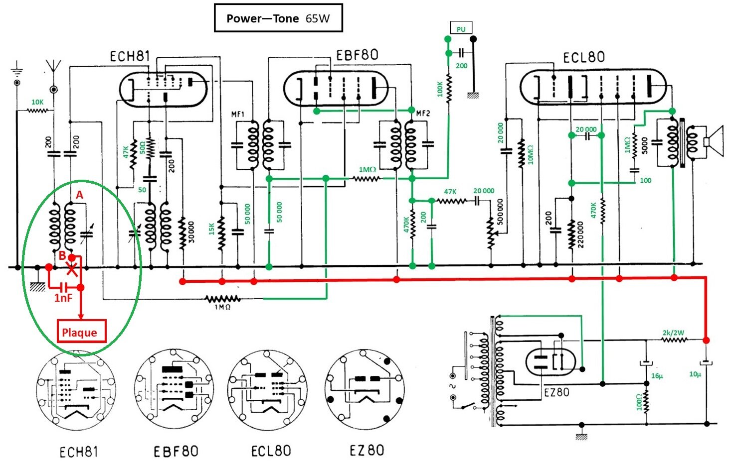 Il s’agit d’un des premiers postes de marque Power Tone sans référence et qui m’a fait découvrir « ma passion pour les transfos MF » dont le schéma s’inspire d’un Ducastel Caprice et modifié pour être conforme au poste d’où les lignes vertes et rouges.