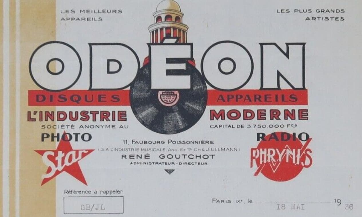 En matière phonographique les disques Odéon étaient à aiguille (gravure latérale) tandis que leurs confrères à saphir (gravure verticale) étaient publiés sous la marque Phrynis. Après la guerre préférée de Brassens à la fin des années 20 Odéon à produit brièvement des disques à saphir sous la marque Odéon.