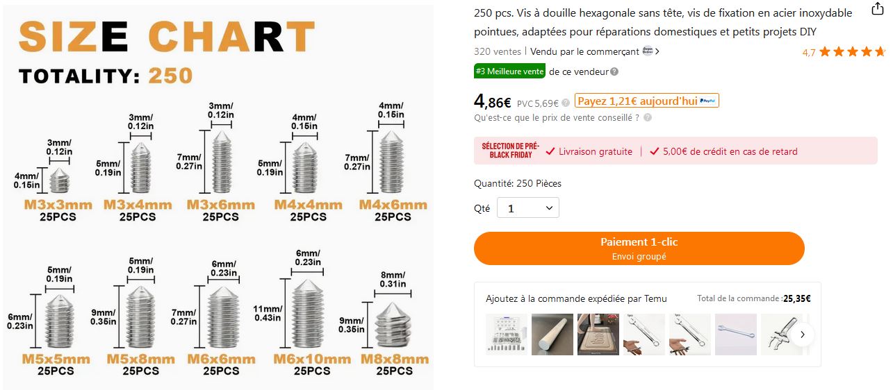 commandé des vis sans tête, moins de 5 € l’assortiment de 250 vis chez T-µ !