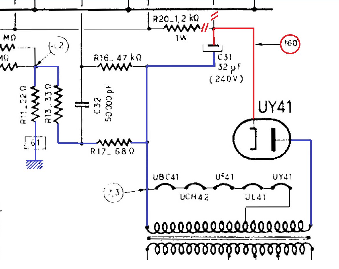 Il peut y avoir des résistances changeant de valeur , ce n’est pas la cause de ton problème, la cathode de la UY41 qui se situe à droite du filament reliée au tube du support central où se trouve R 20 , 1k2 pas 1w mais 3 où 4 w, tu dois trouver plus de 160V continu , ce que je ne comprend pas , sinon le support serais défectueux, où la plaque de l’autre coté des filaments ne reçois pas les 160V alternatif venant du transfo ;