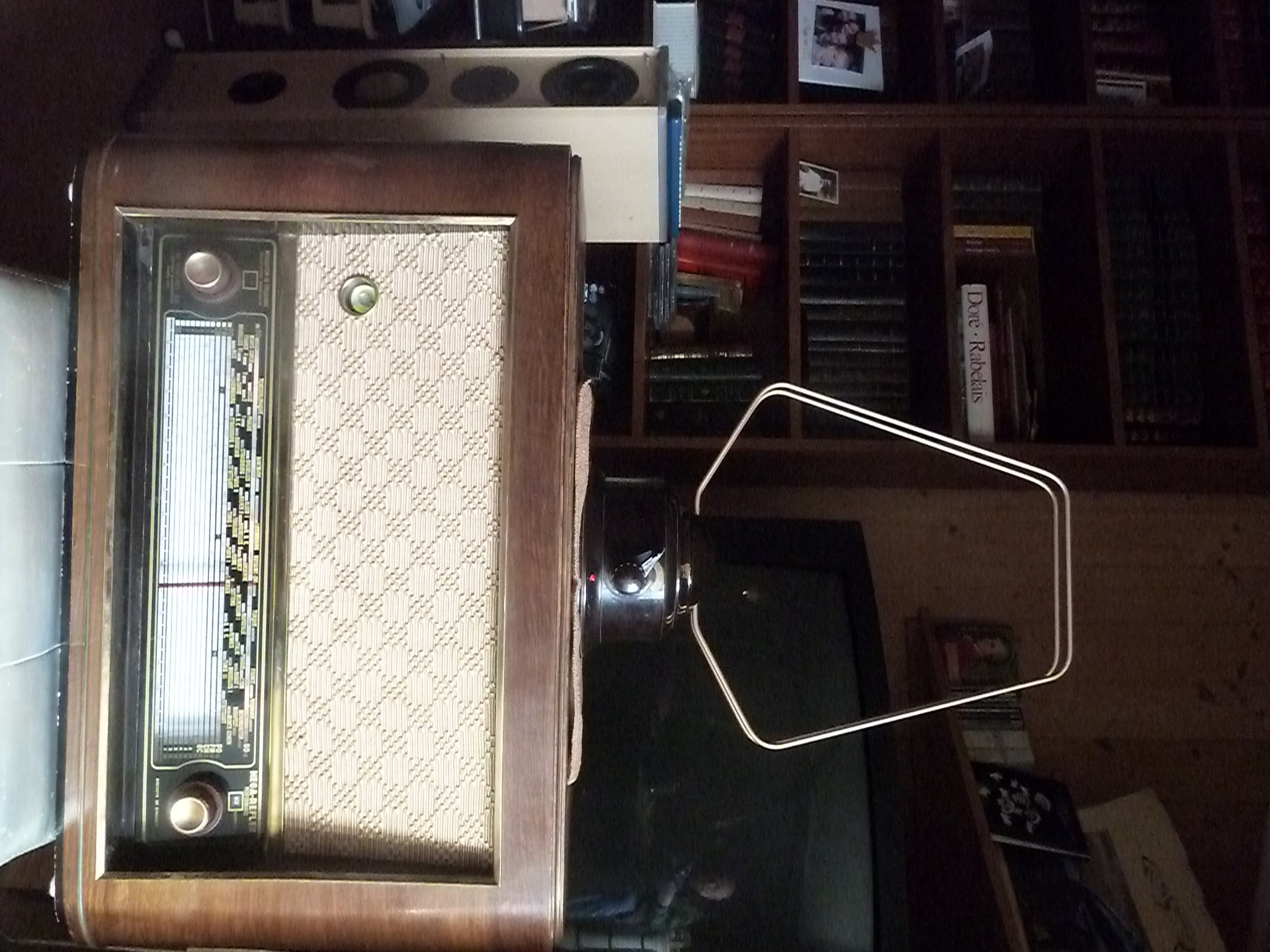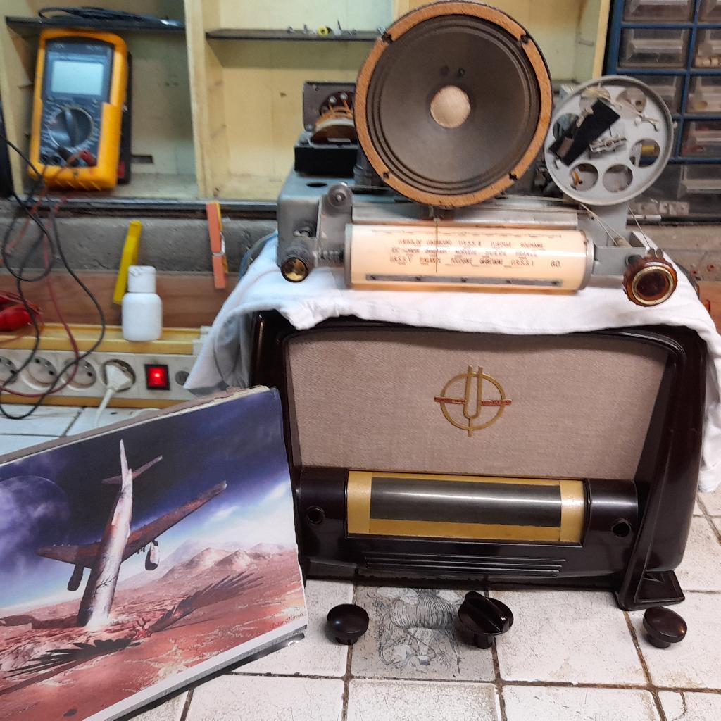 Par ailleurs, comme je le disais il y a peu de temps sur le forum de Tsf-Radio, je trouve que le plus délicat sur ces Ducretet-Thomson à cadran rotatif c’est de changer le tissu du HP et surtout le fragile protège cadran des stations que l’on trouve souvent abîmé ou carrément absent. Voici une image de mon L124 en cours de révision avec un nouveau tissu de HP et un protège cadran que j’ai dû fabriquer car celui d’origine était absent: