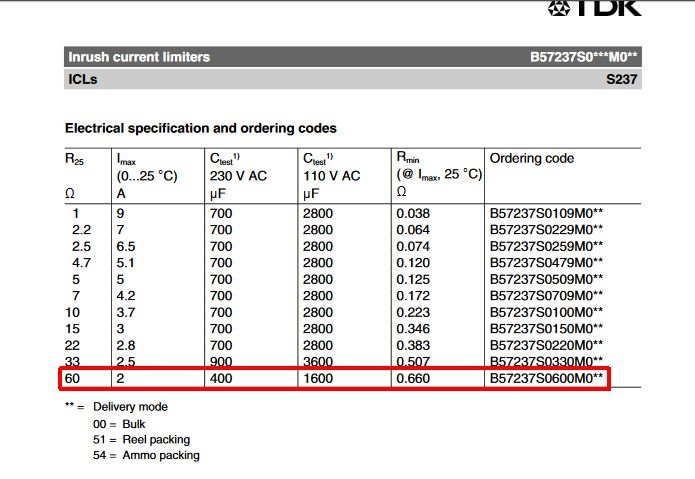 D’après le tableau TDK, c’est celle encadrée en rouge qui semble correspondre (même valeur de capa, même valeur à froid):