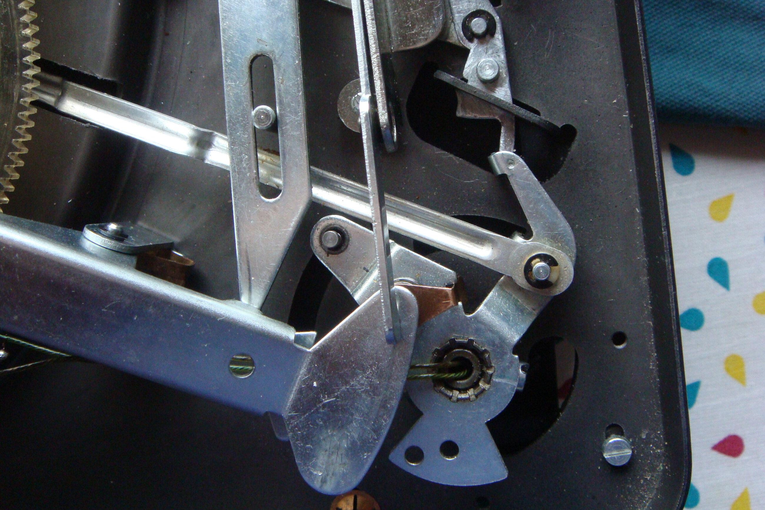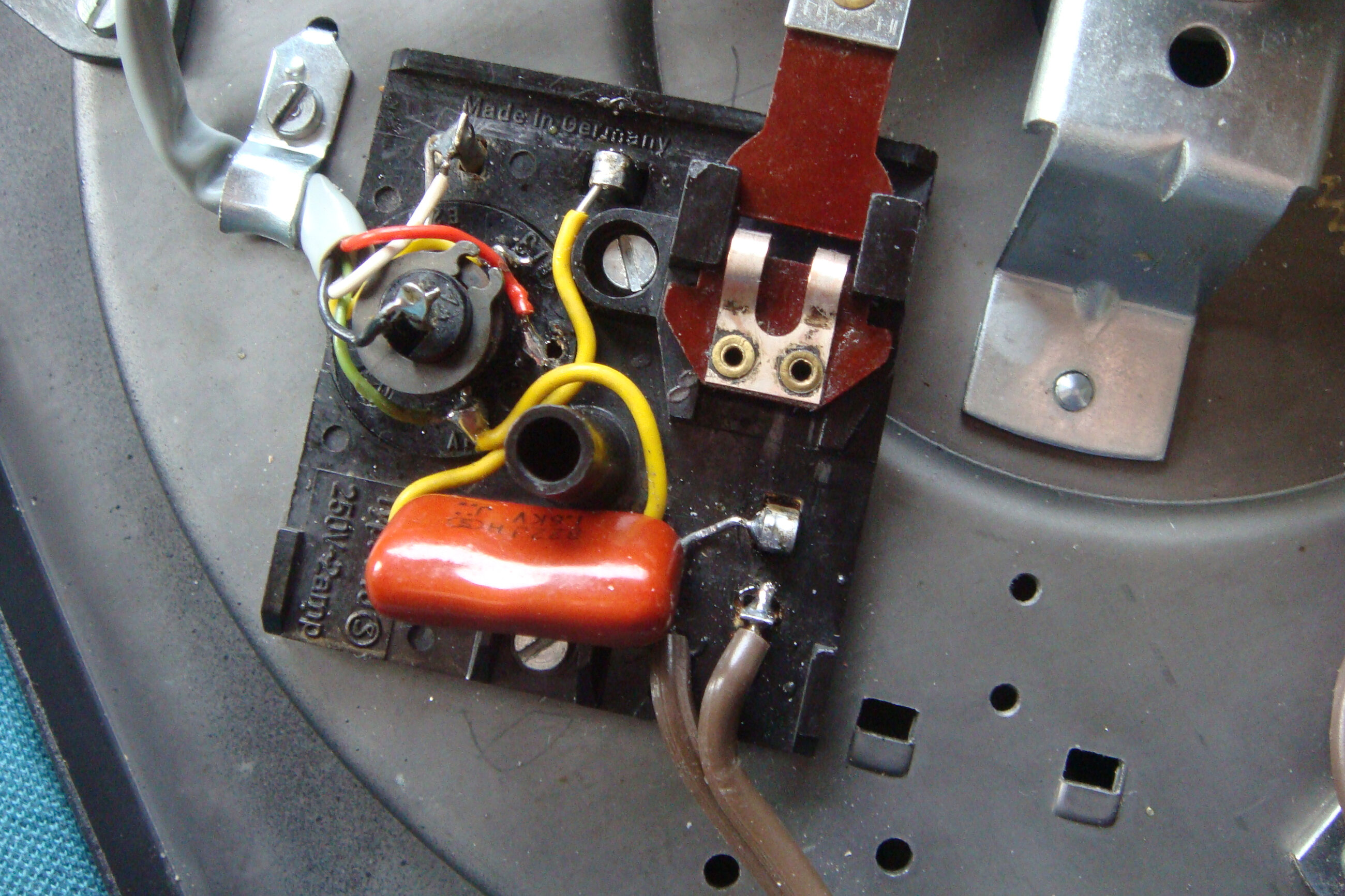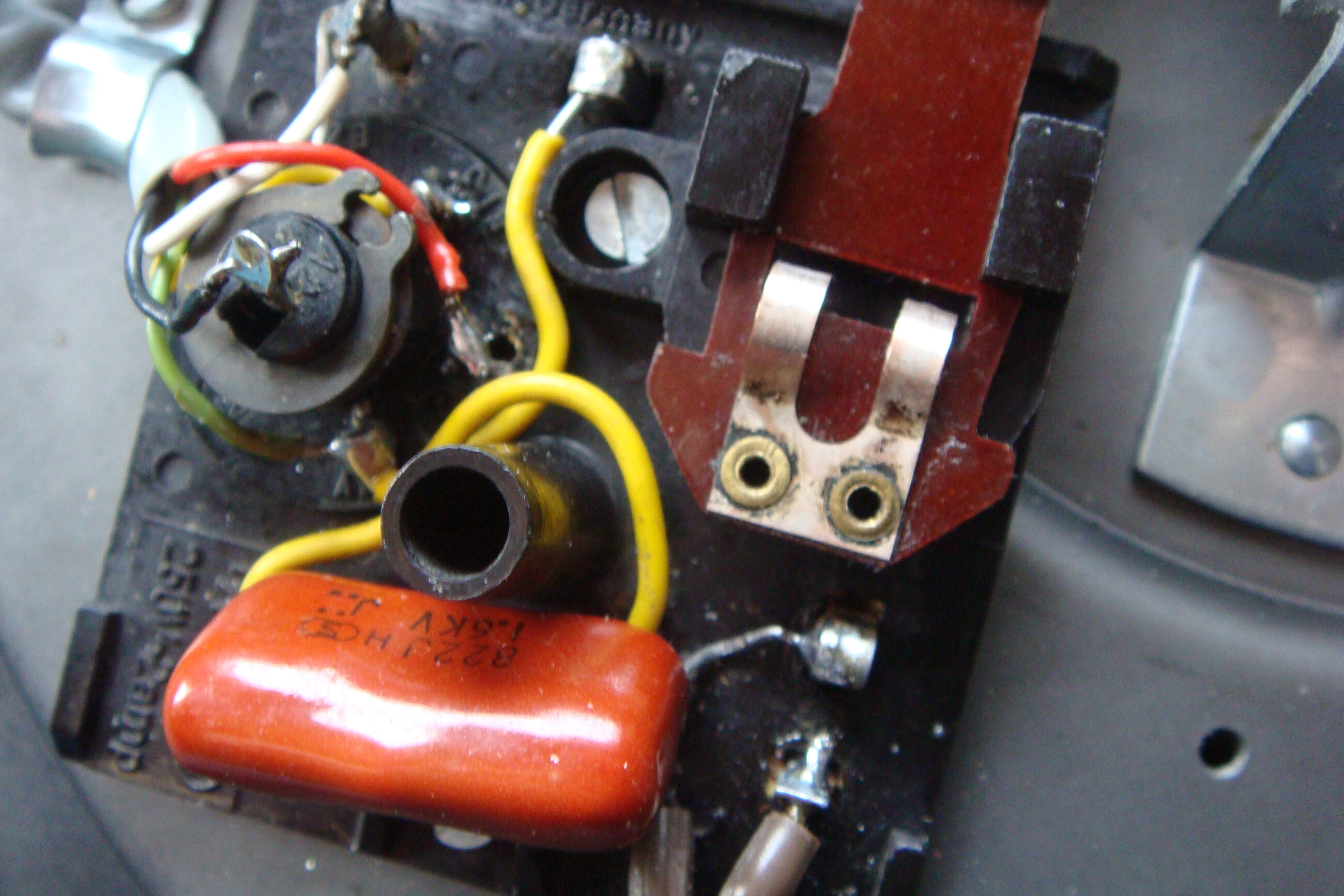 Le système à ressort qui maintient le contact dans le boîtier noir : je pense savoir à quoi vous faites allusion (je suppose que le boîtier noir est celui où arrive le secteur et ou se trouve un interrupteur pour la mise en route ou l’arrêt du moteur. Cet interrupteur est commandé par quelque chose. Il faudrait que vous mointriez par quoi sur une photo, ainsi que la tringle qui l’actionne.