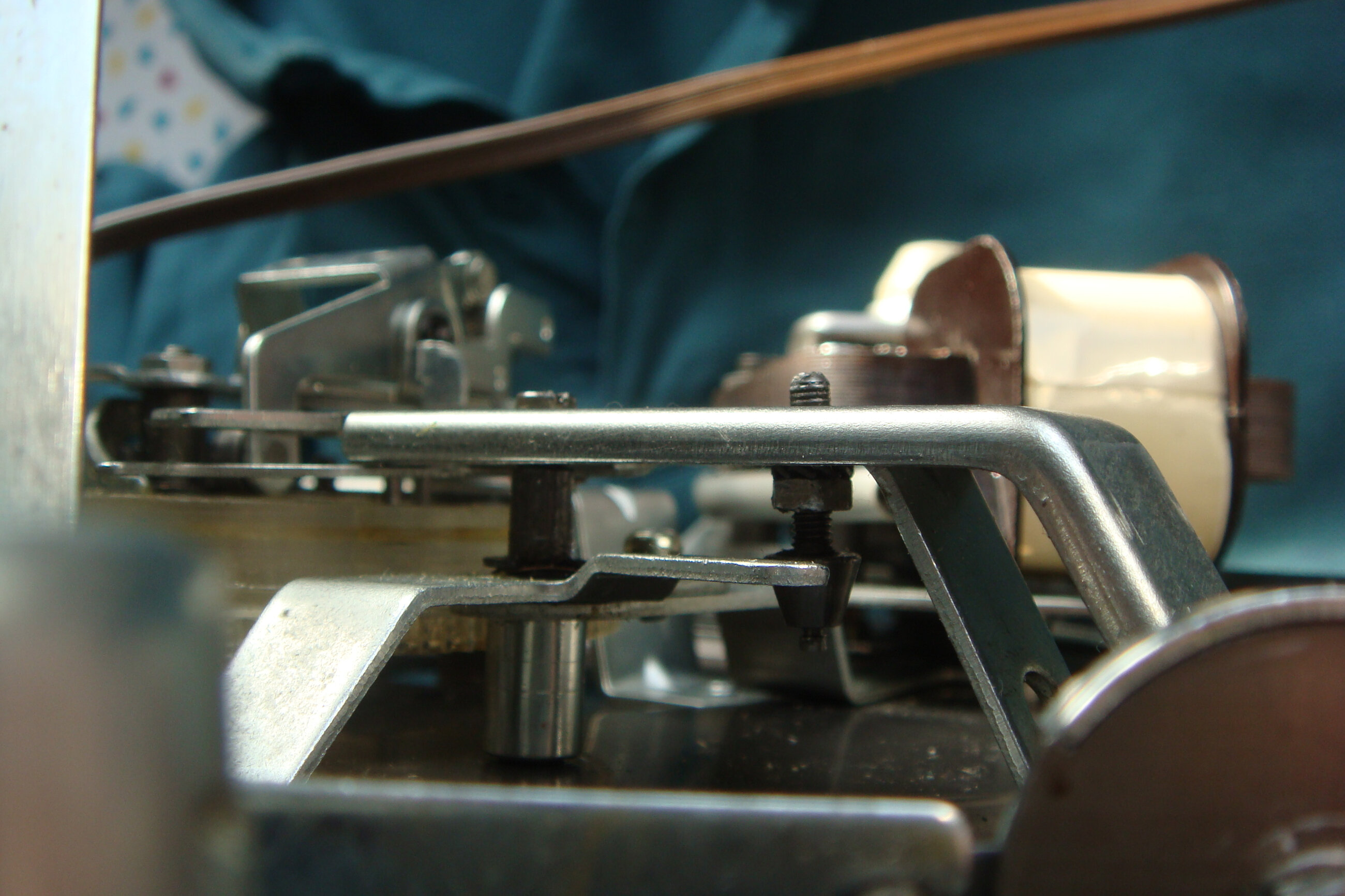 - observez ce qui se passe. A un moment, le bras doit se positionner sur le disque. Étant donné votre panne, vous devriez voir le levier actionner le contacteur et couper le courant. Ça vous permettra de mieux comprendre le mécanisme, voir où se situe le problème (normalement) et procéder aux réglages (ou constater qu’un levier est mal positionné).