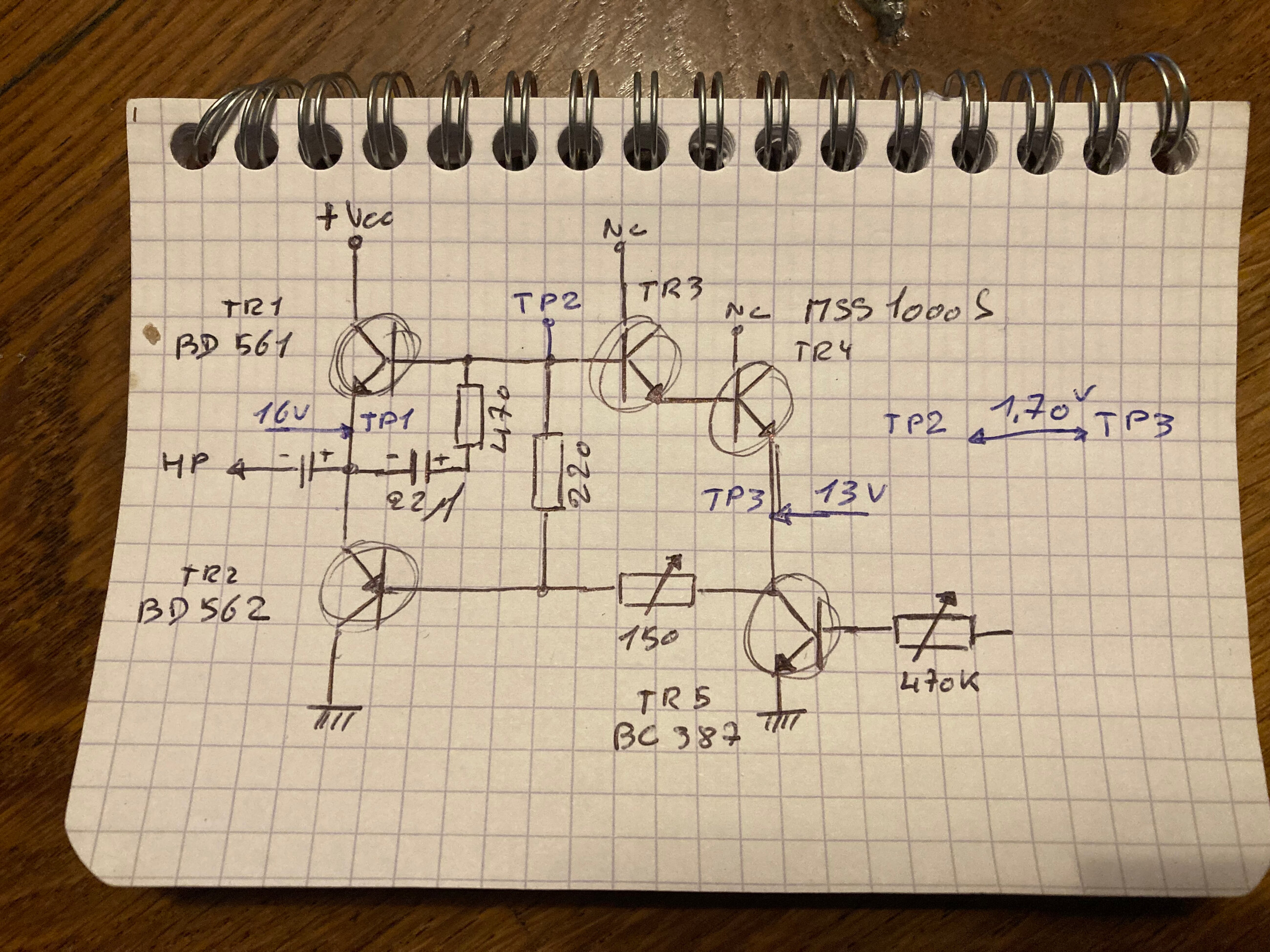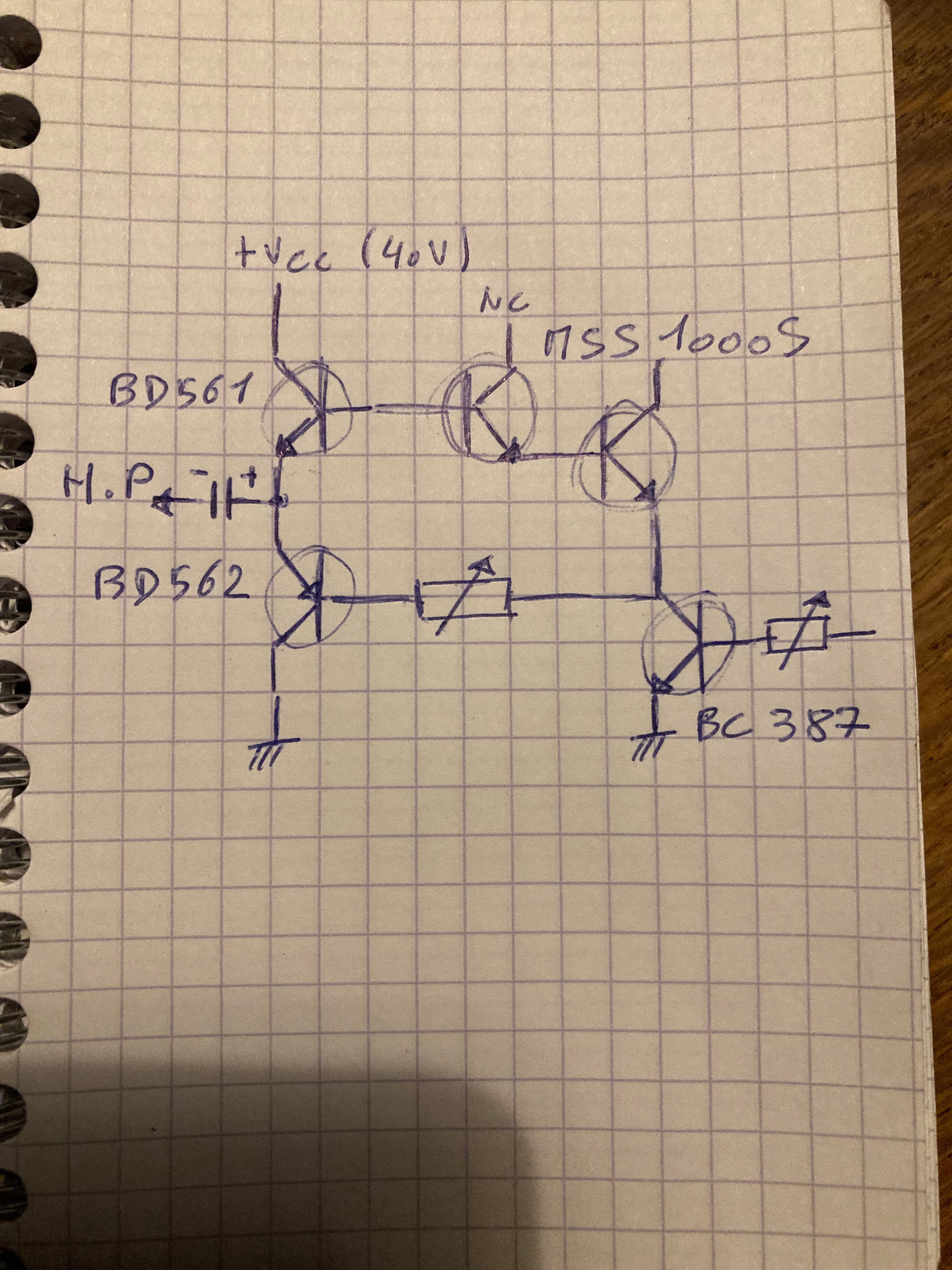 Sur lequel ne n’ ai rien trouvé, (si vous savez ou trouver la doc technique, je suis preneur), en panne, et je soupçonne des transistors; MSS1000S, sur lequel je n’ ai rien trouvé non plus, avec un montage que je ne connais pas, qui simplifié ressemble à ça;