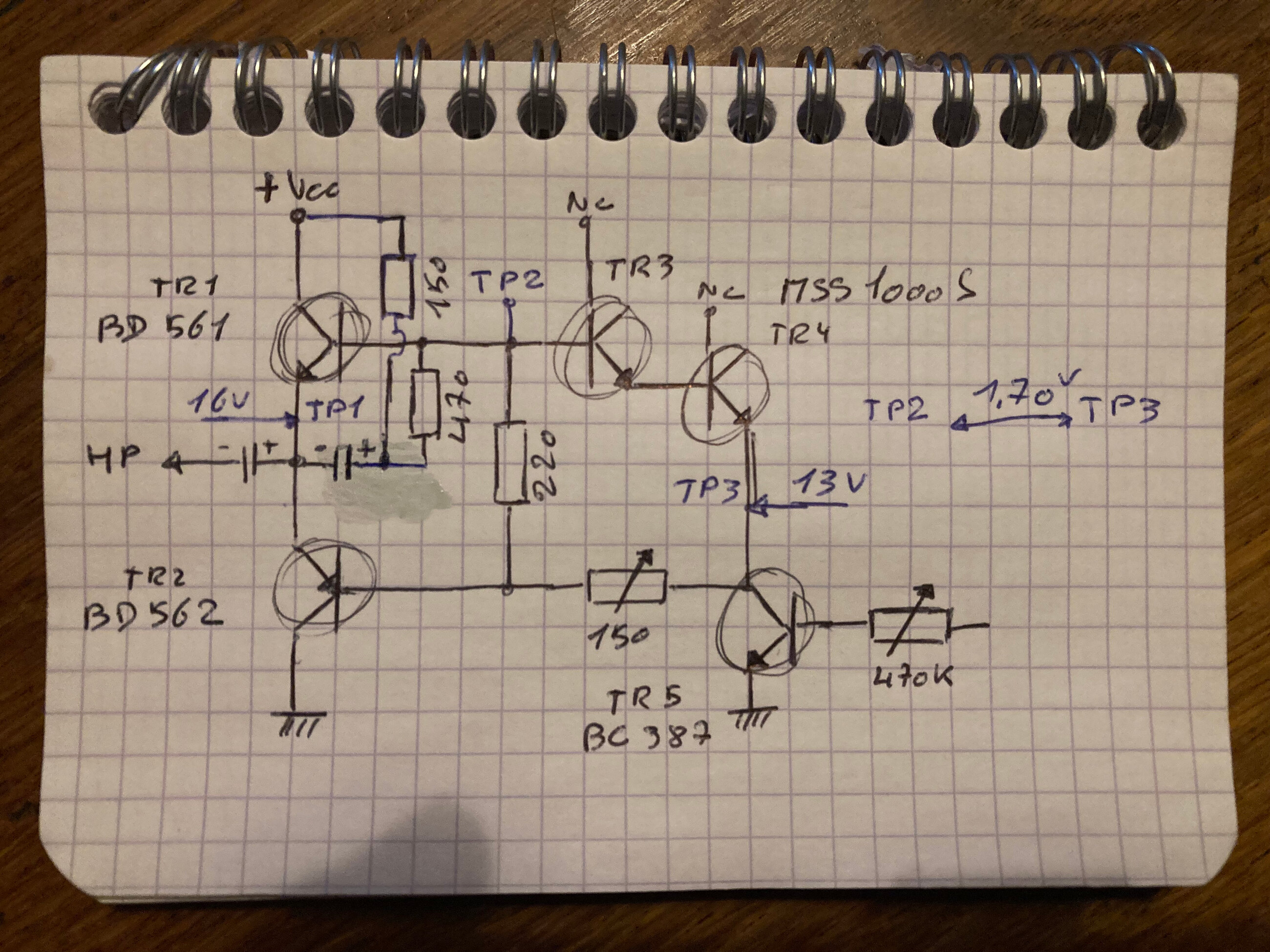 Avec Vcc = 40 V et le point milieu de sortie à 16 V, le circuit peut fonctionner, au moins sortir un peu de puissance, avec de la distorsion. Passe-t-il du courant dans Tr1 ?