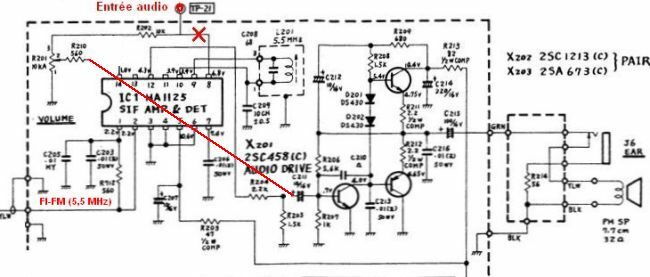 Il y a un préampli audio entre les pins 14 et 12 du HA1125, si les bricoleurs qui ont ajouté le son AM ont relié directement la sortie du démod AM à l’ampli de sortie (C211) c’est peut-être parce qu’ils ont cramé le préampli interne du HA1125 avec leurs manips