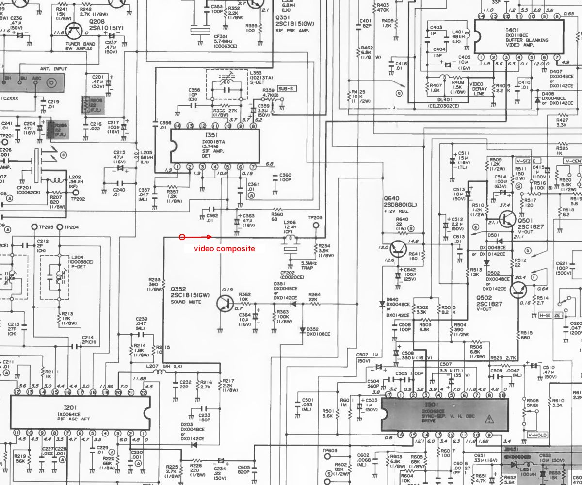D’après les schémas, la vidéo démodulée sort du circuit I201(pin 20) pour aller vers I401 (pin 3) après passage par un réjecteur de la porteuse son à 5,5 MHz.