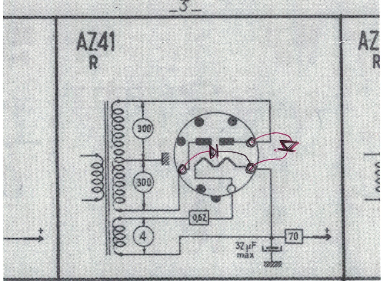 Aucun fil a débrancher, et, ça permet de mettre en évidence le décès de la valve, si tu obtiens une tension redressée normale(un peu plus forte avec les diodes ).