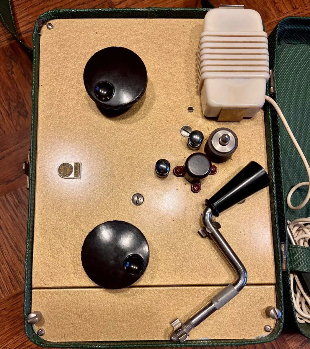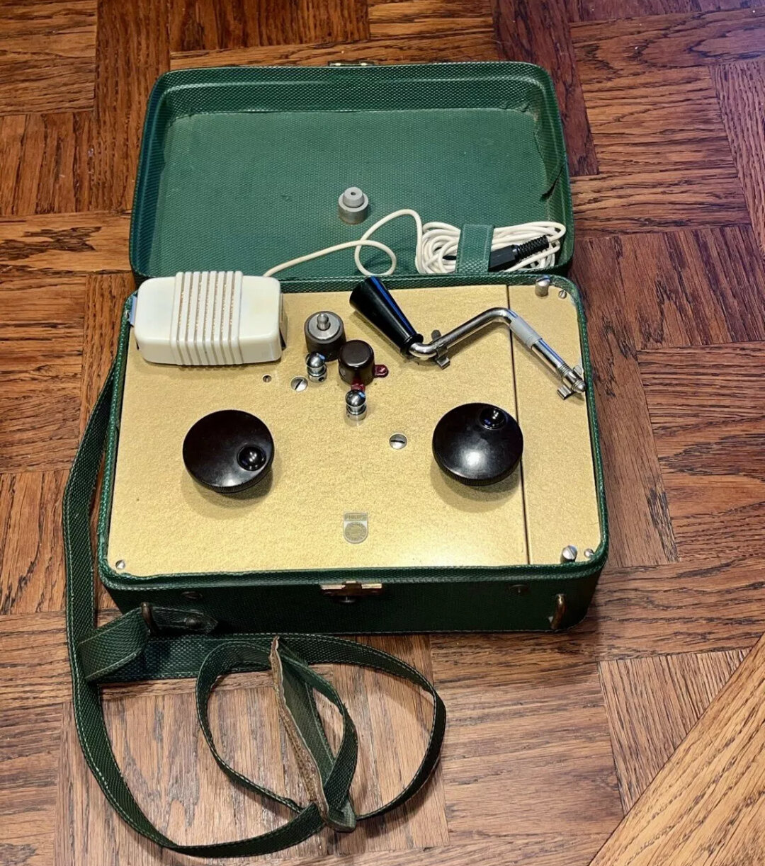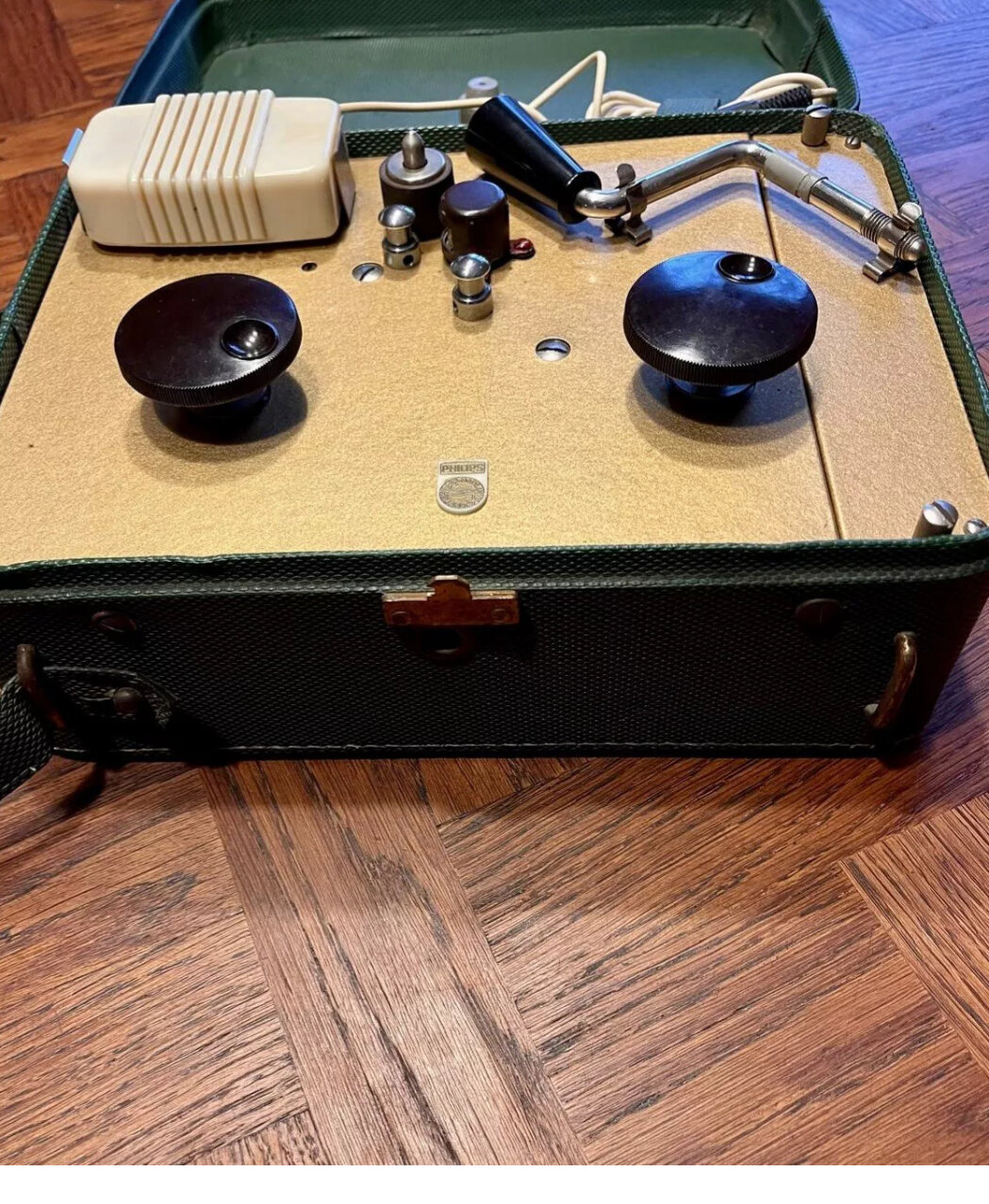 Voilà que je découvre hier, moi le passionné de magnétophones, que Philips avait aussi fait un appareil portable à manivelle ! Comme le Nagra I et II ! Et comme d’autres fabricants. J’ai découvert ça sur eBay. Vendu pour la « modique » somme de 5000€ par un annonceur et 14.000 € par un autre !