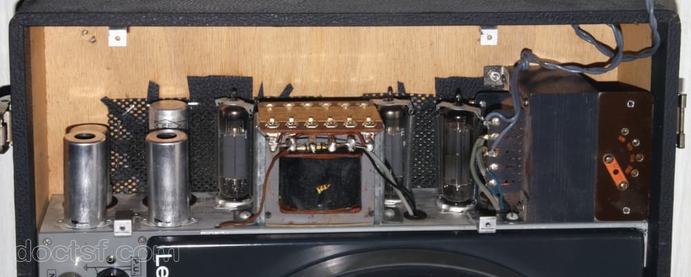 Je crois qu’à l’intérieur il y a un push-pull de EL84 avec un TS Audax TU 101… La platine n’est pas une Barthe mais une Lenco B51.