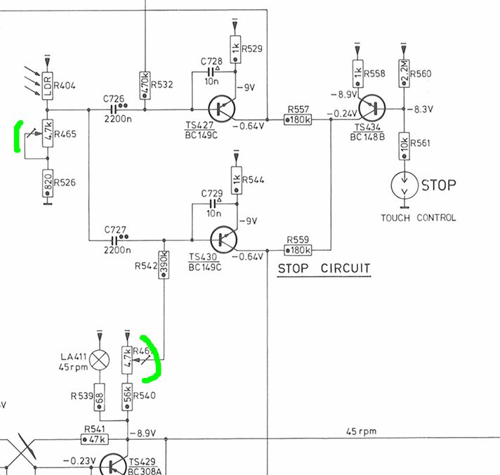 Bonjour. L’arrêt automatique en fin de disque ne fonctionne plus. L’ampoule qui éclaire -ou pas- la LDR fonctionne. La résistance de la LDR dans le noir est de 2,7 K Ohm, éclairée par une Led « un peu forte » elle descend à 1,3 K Ohm. Ça me parait très faible dans le noir, mais je ne trouve pas la référence de cette LDR sur le manuel de service (joint). A vot’ bon cœur