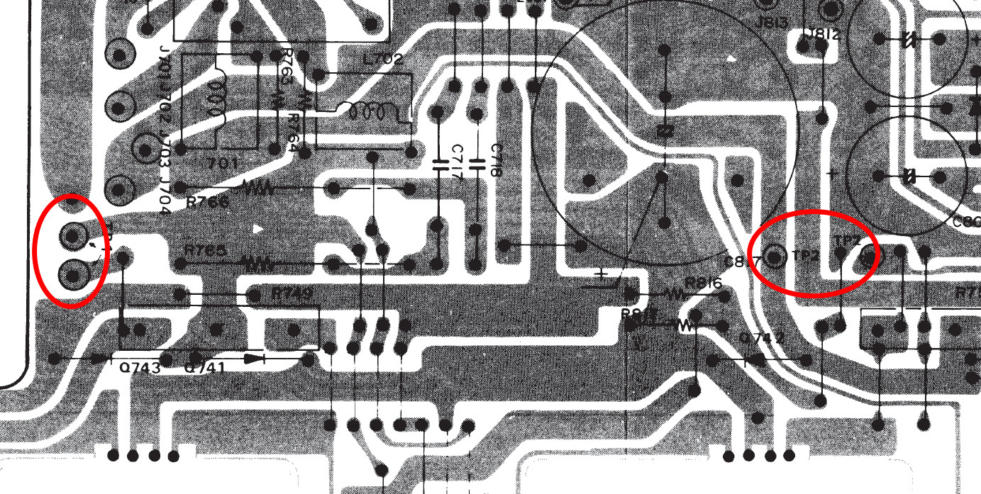 Après tous ces remplacements il me semble logique et nécessaire de régler les courants de repos. Le service manual stipule qu’il faut se placer successivement en TP1 puis en TP2 et de régler les potentiomêtres ajustables R737 et R738 concernés pour obtenir 8 mV sur chacun des points test…Mais en cherchant ces derniers je n’arrive pas à les localiser ni sur le schéma ,ni sur le circuit imprimé!
