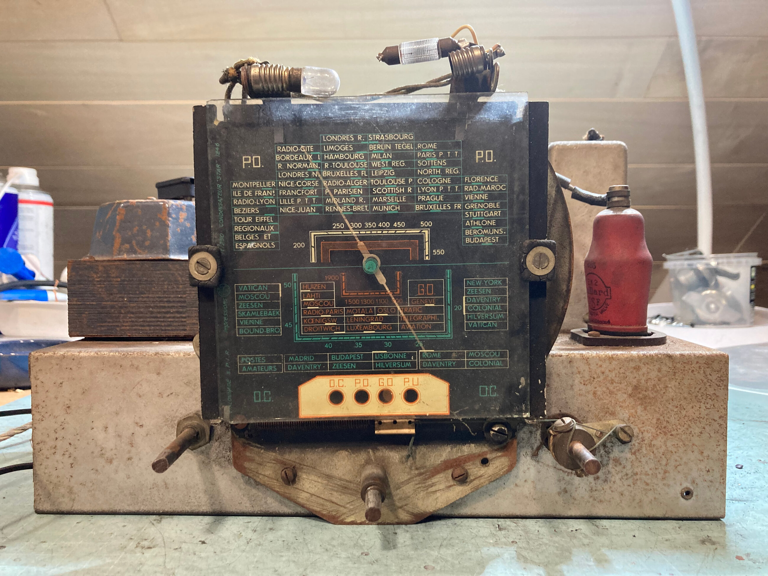 Le poste est probablement de 1936-1937 (peut être 1938 si d’une fabrication « tardive ») il ne peut pas être de 1935 (les lampes transco existaient en 1935 mais elles étaient jaunes, pas rouges) et pas postérieur à 1937-38 (il n’y aurais plus les mêmes stations sur le cadran, et sans doute d’autres types de lampes)